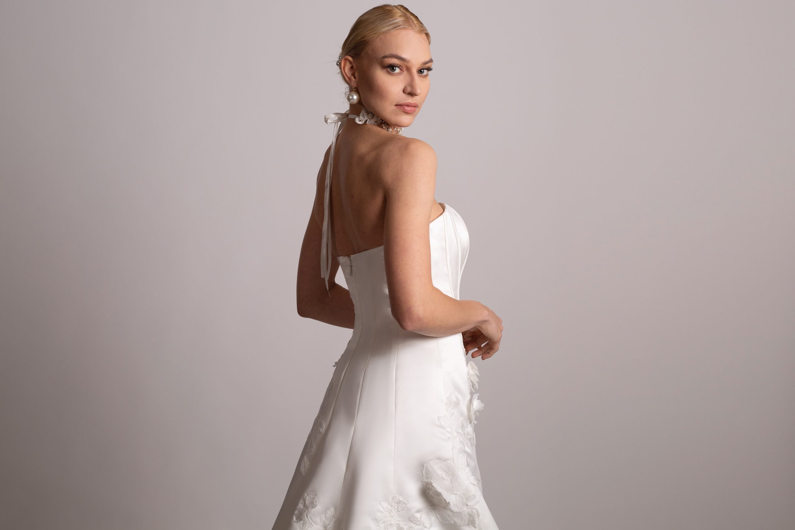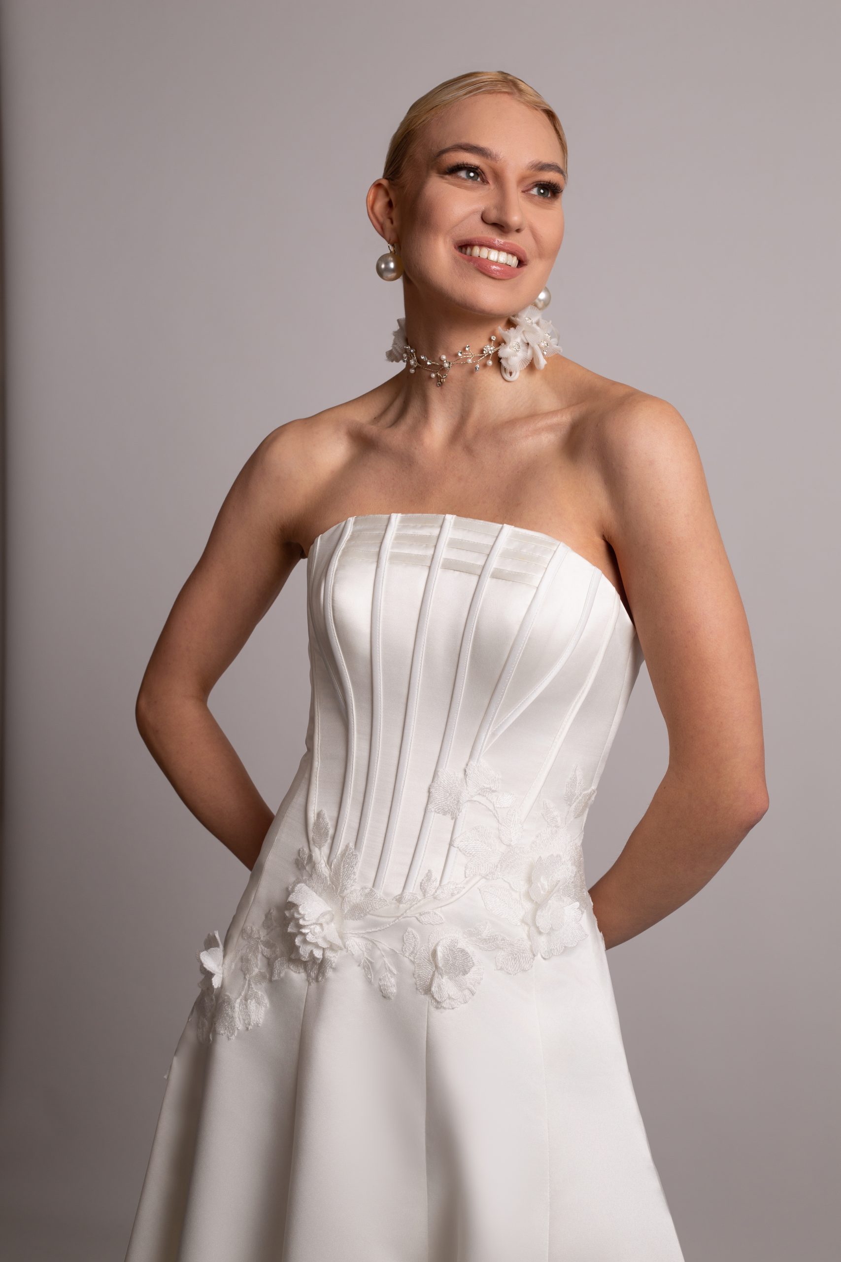 An A line silhouette featuring a structured strapless bodice with corset boning details. Decorated in floral motifs on the base of the skirt and subtly placed on the hip.