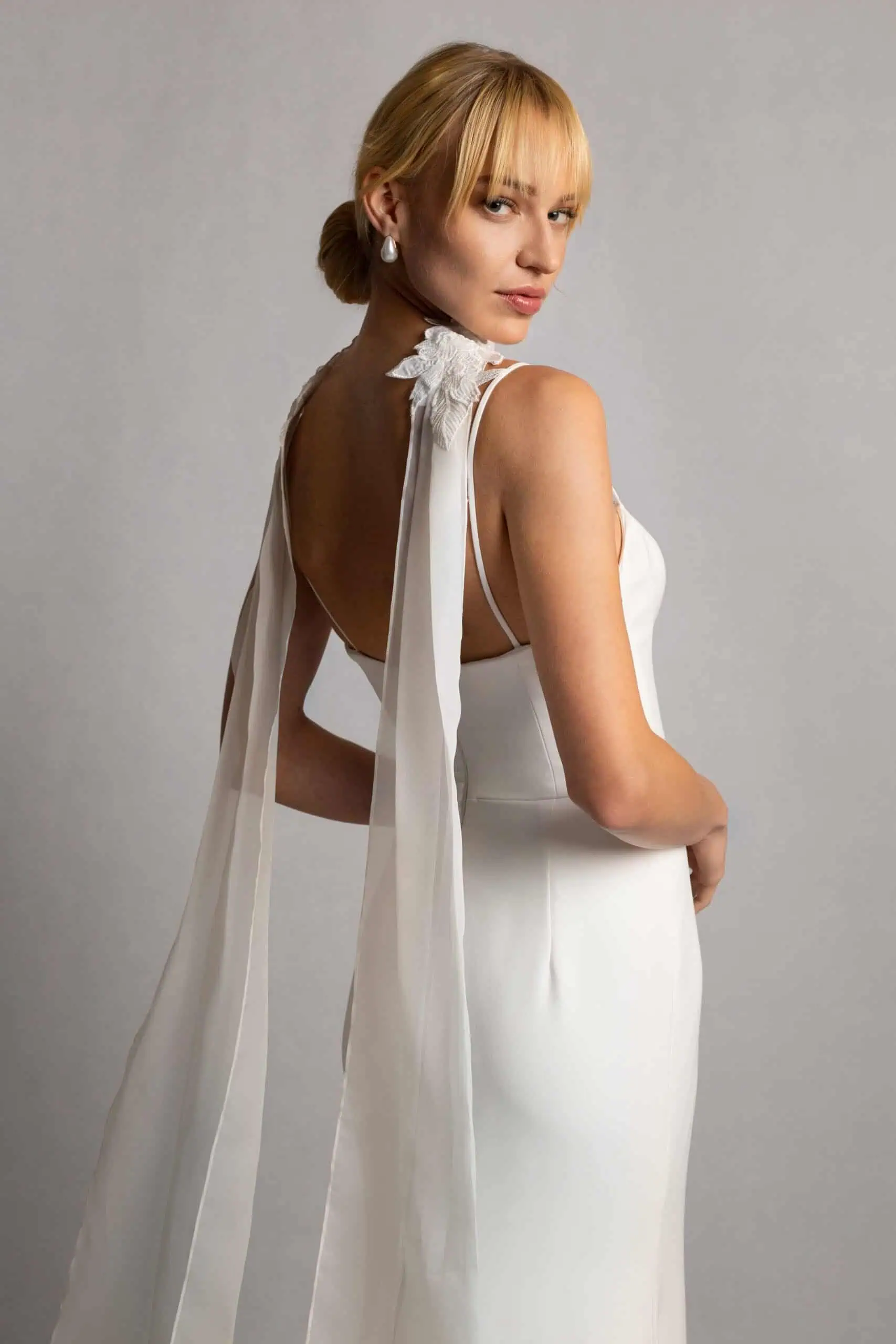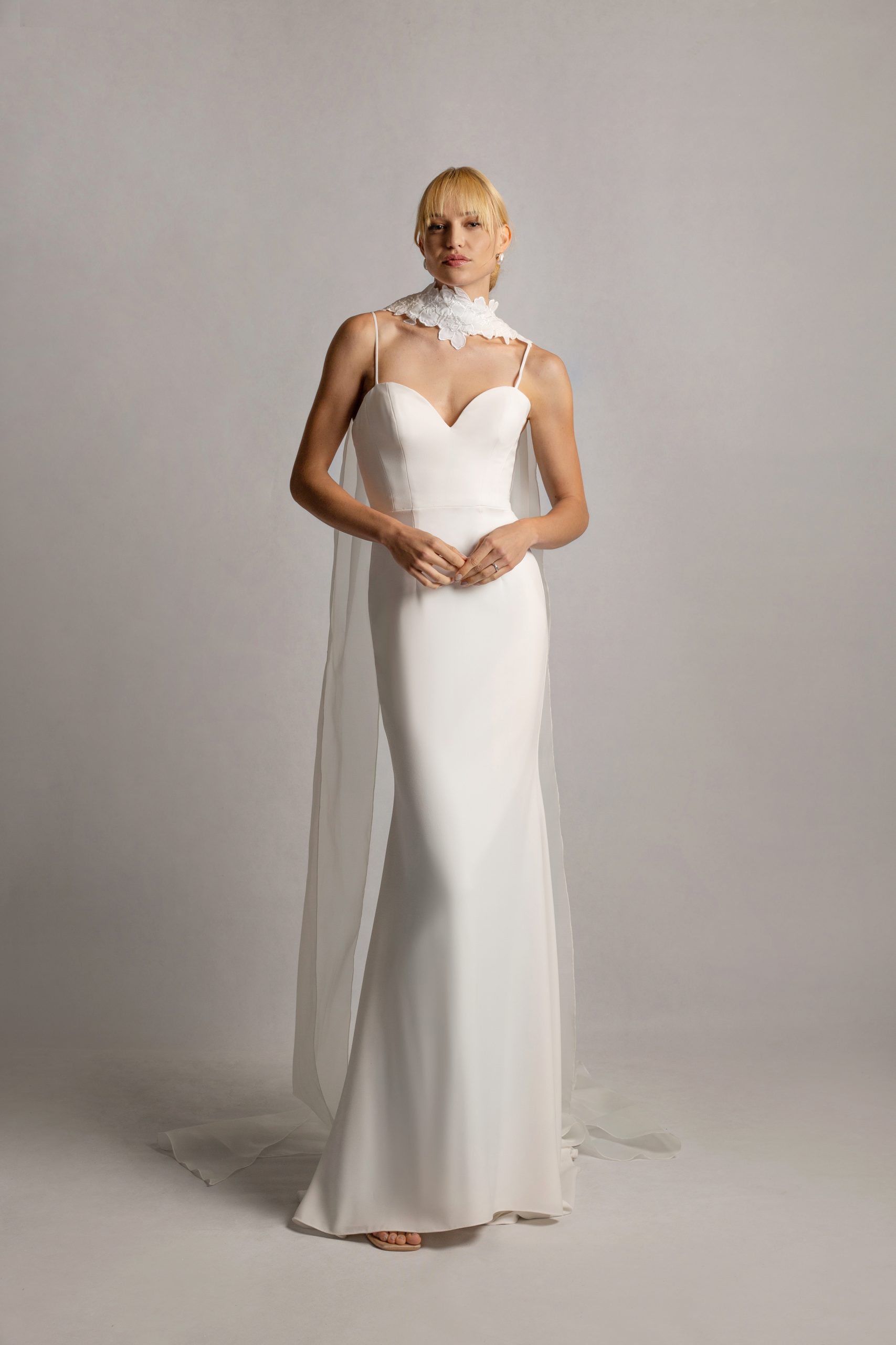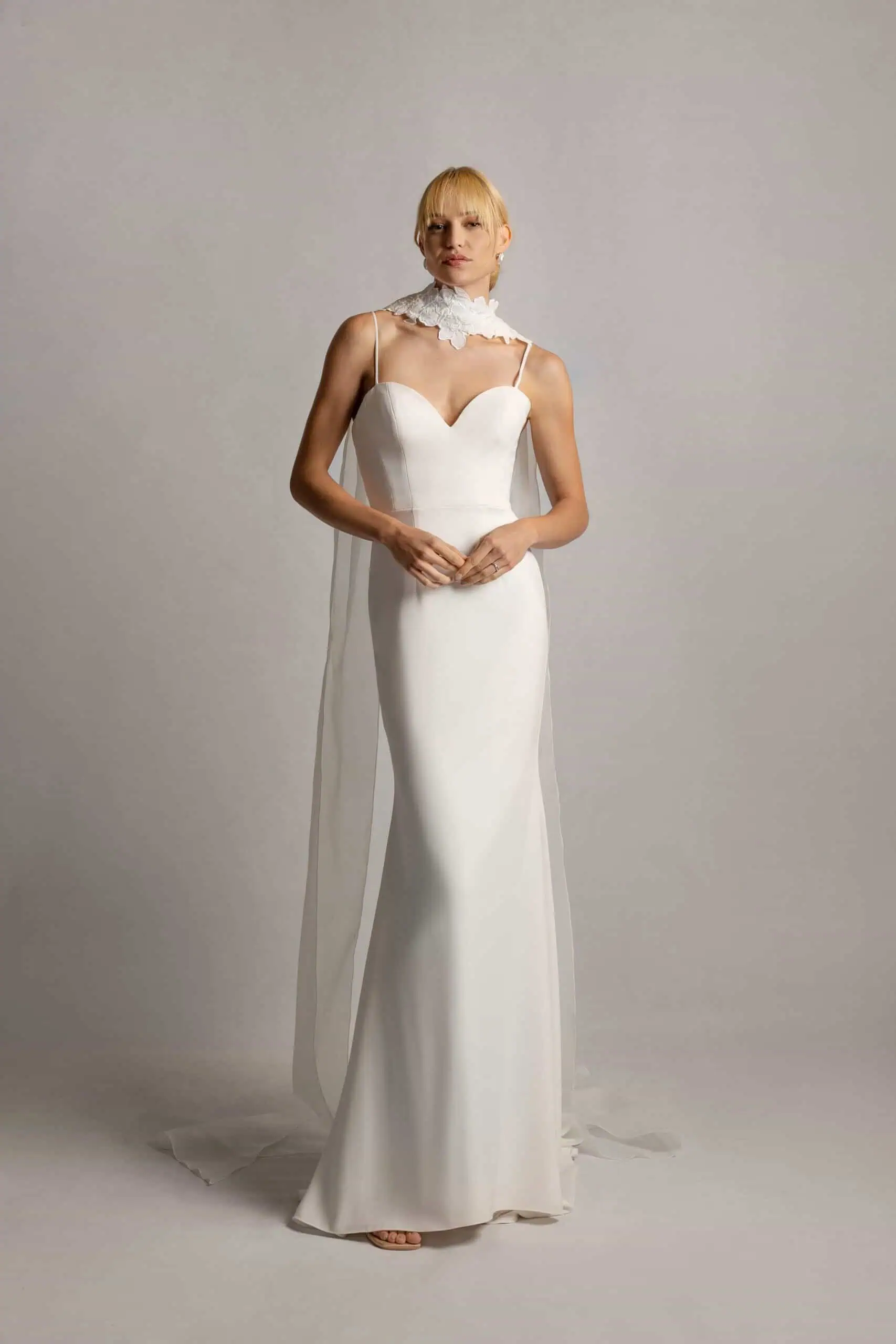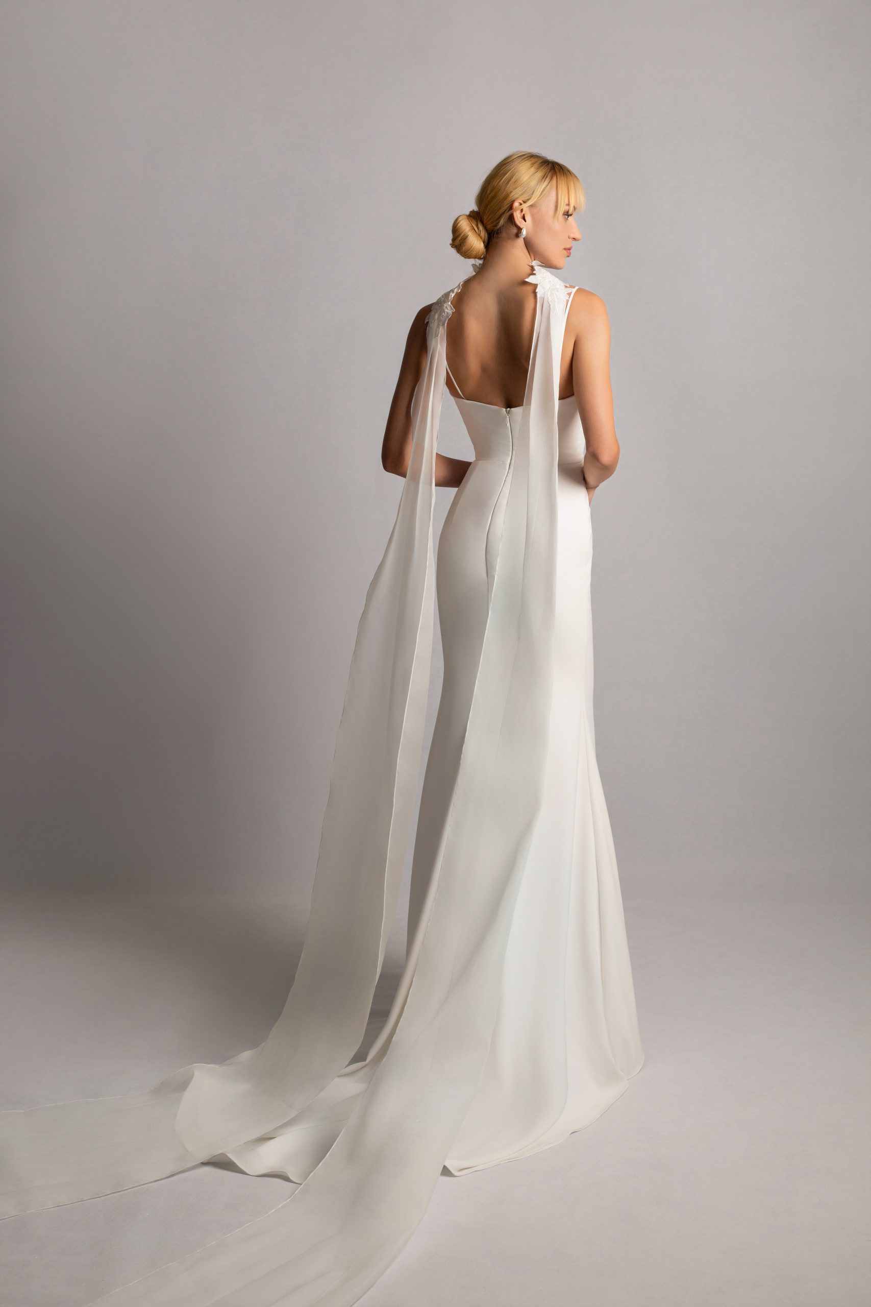 Floral neck appliqué cathedral-length organza drapes for a dramatic yet romantic finish.