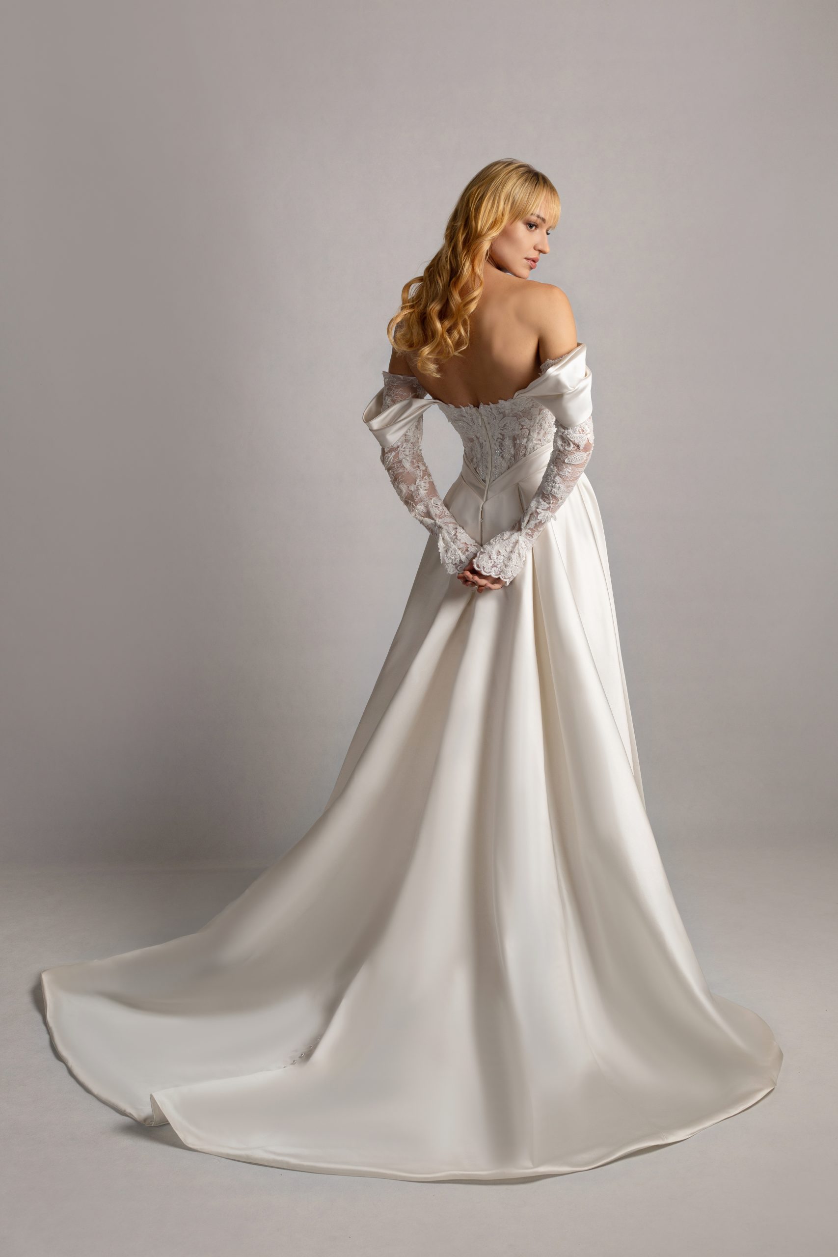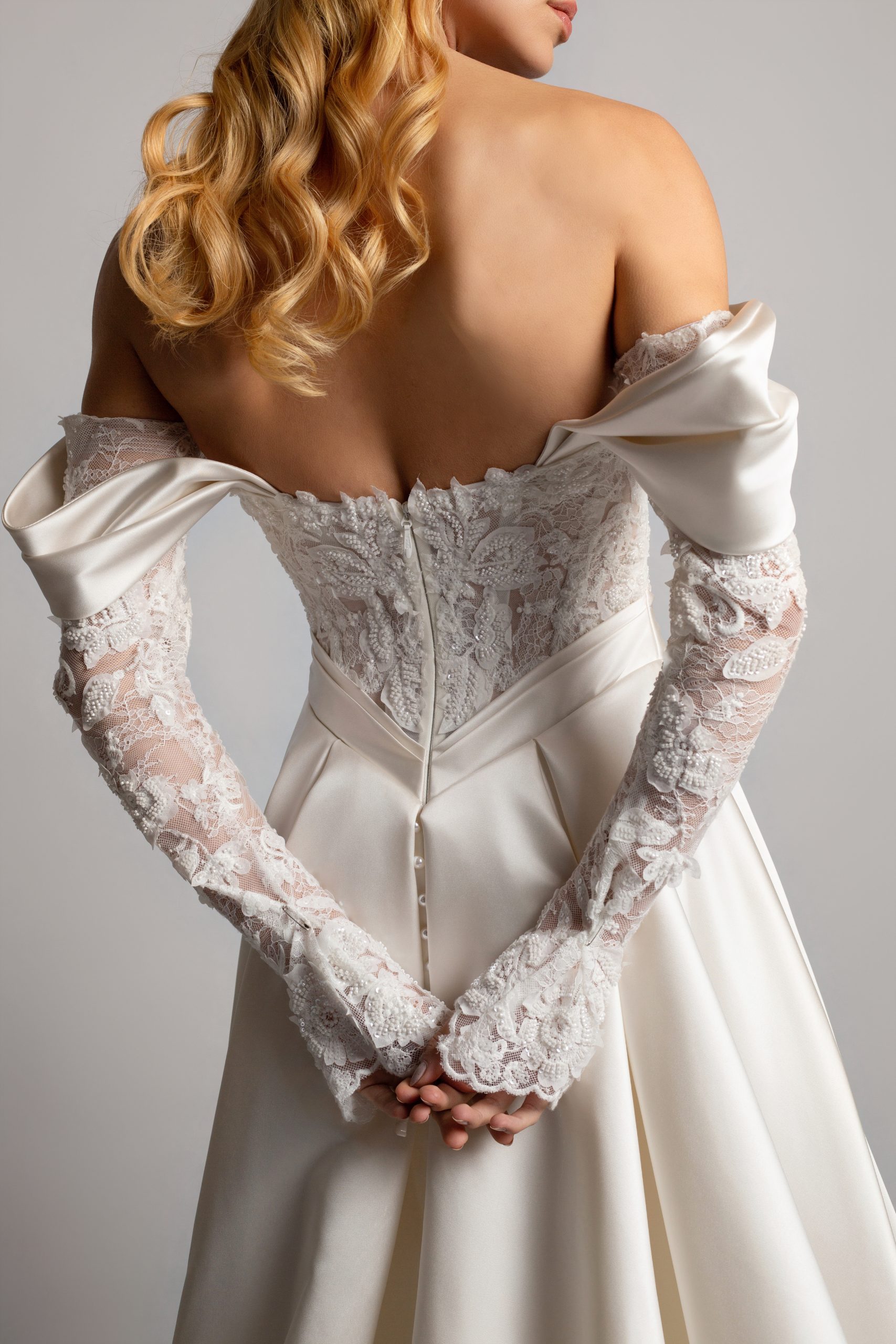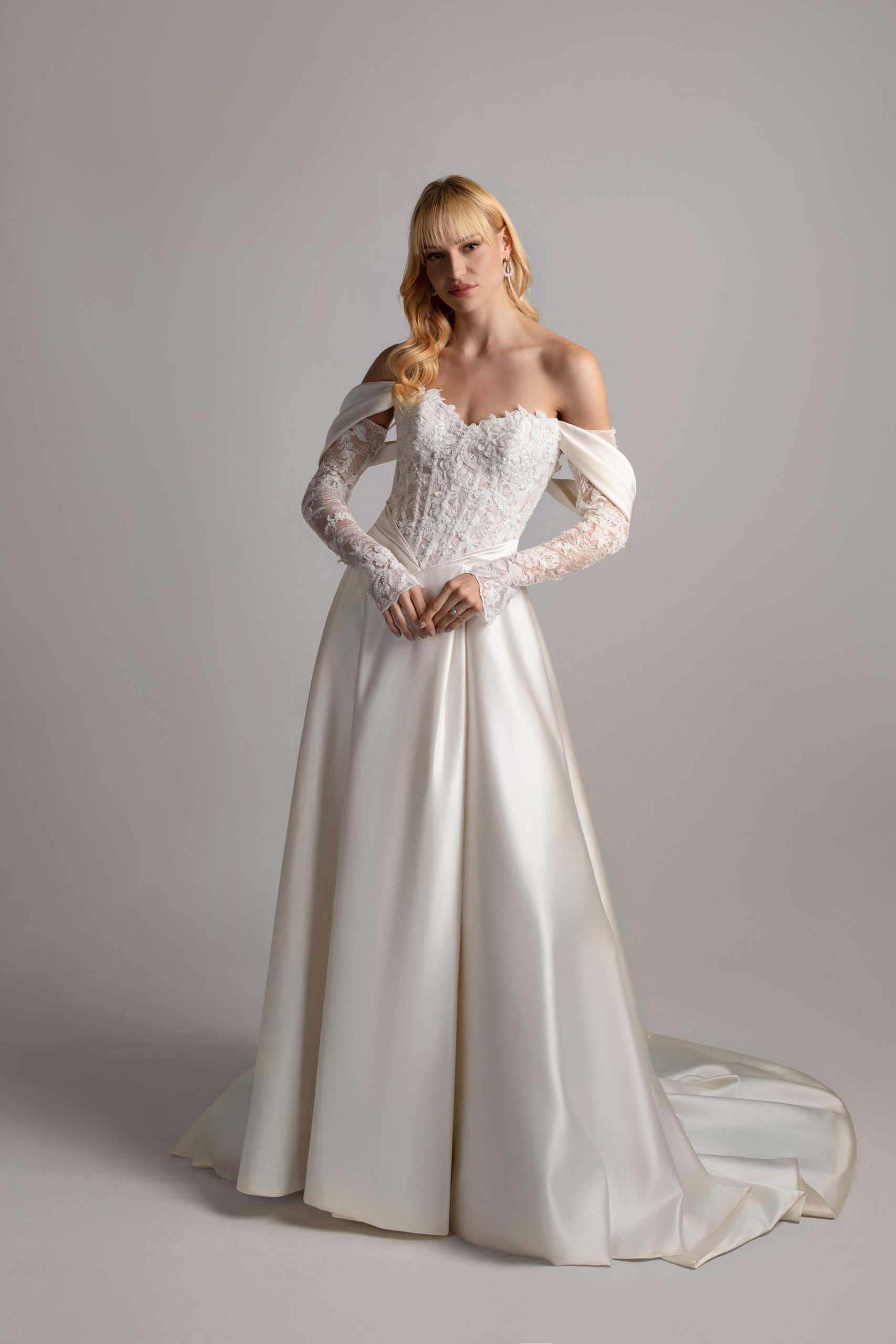 A timeless bridal silhouette with a beaded lace basque-lined bodice, versatile detachable sleeves, pleated satin waistline, and a refined satin split for understated drama
