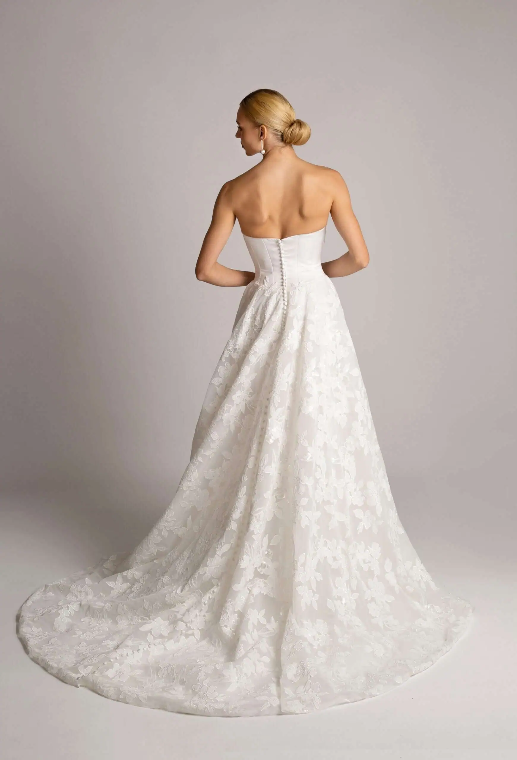 sleek bodice adorned with illusion printed organza, featuring an elegant pleated drape including a floral organza stole