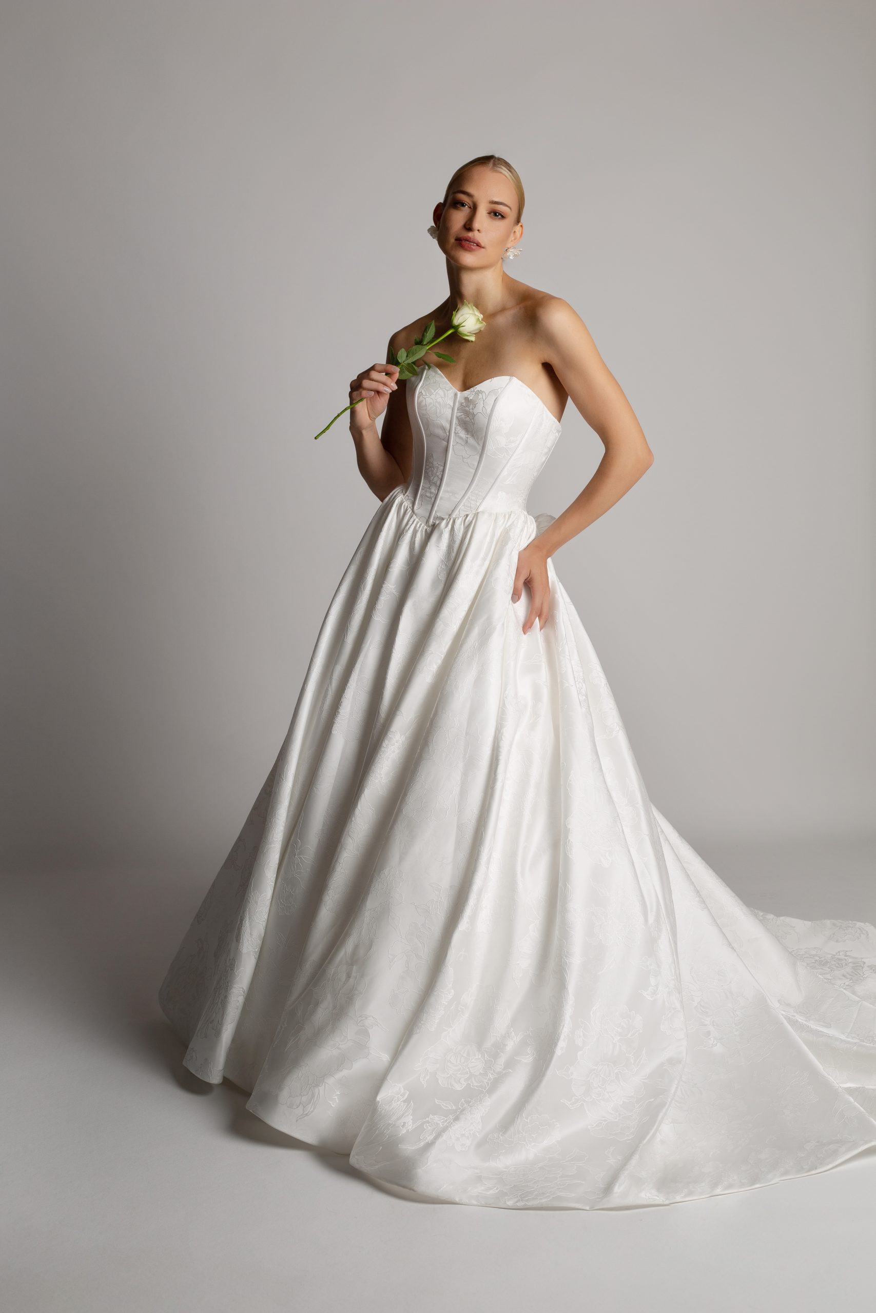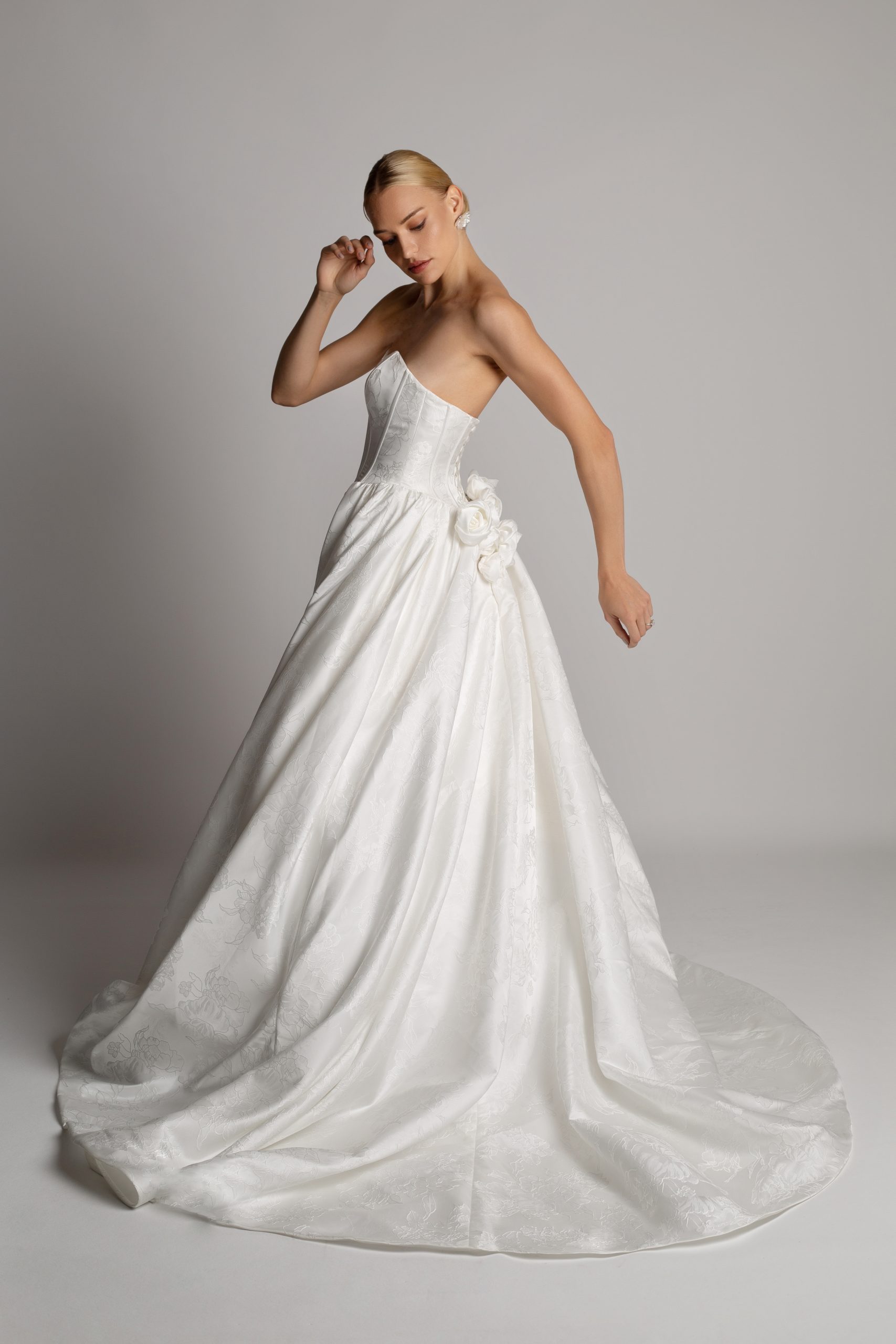 With its rose jacquard fabric and refined satin twist at the neckline, this gown balances structure and softness through a boned longline bodice and a gathered, flowing skirt