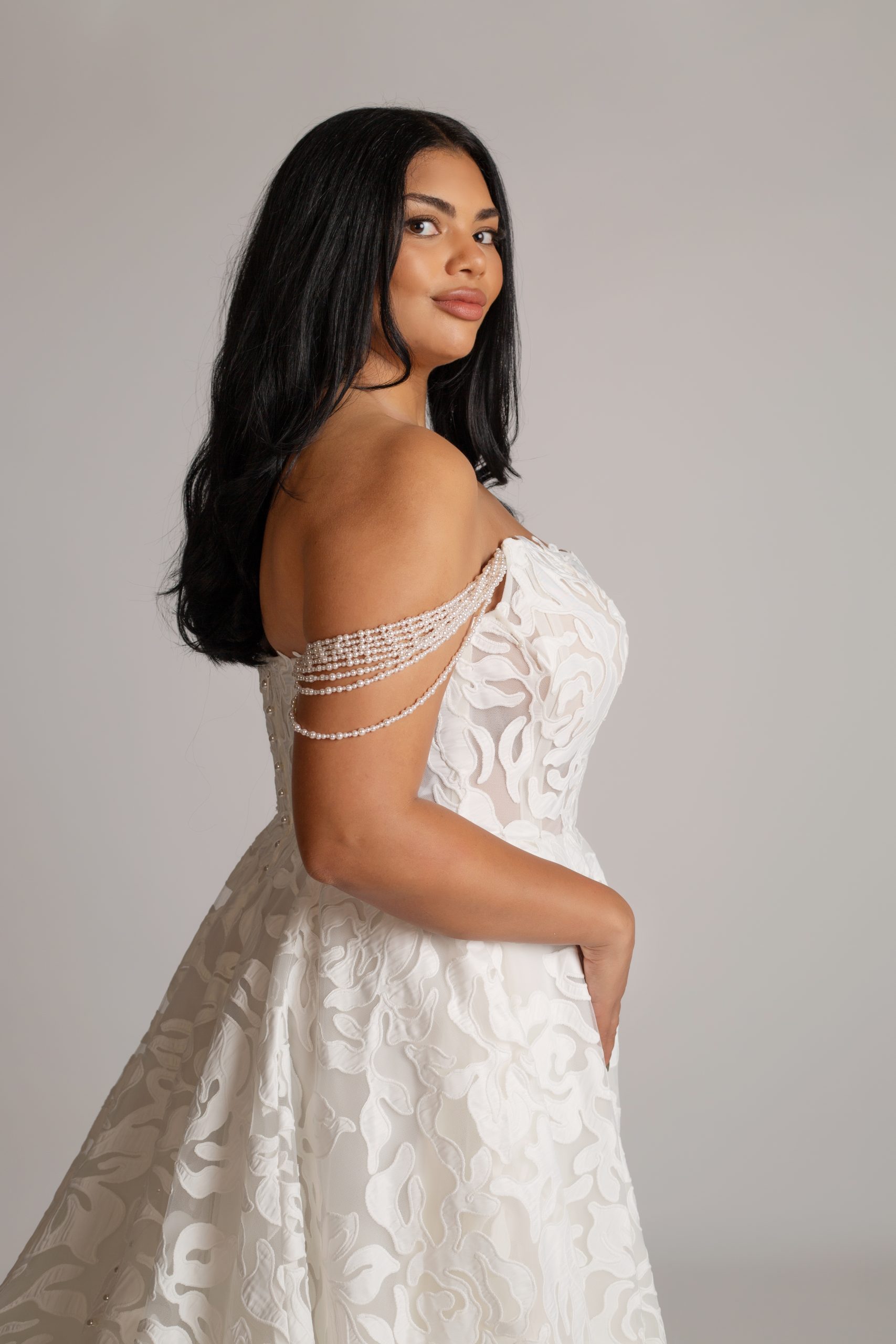 A sweeping ballgown with a scoop neckline, adorned with delicate pearl embellishments across intricately cut-out fabric.