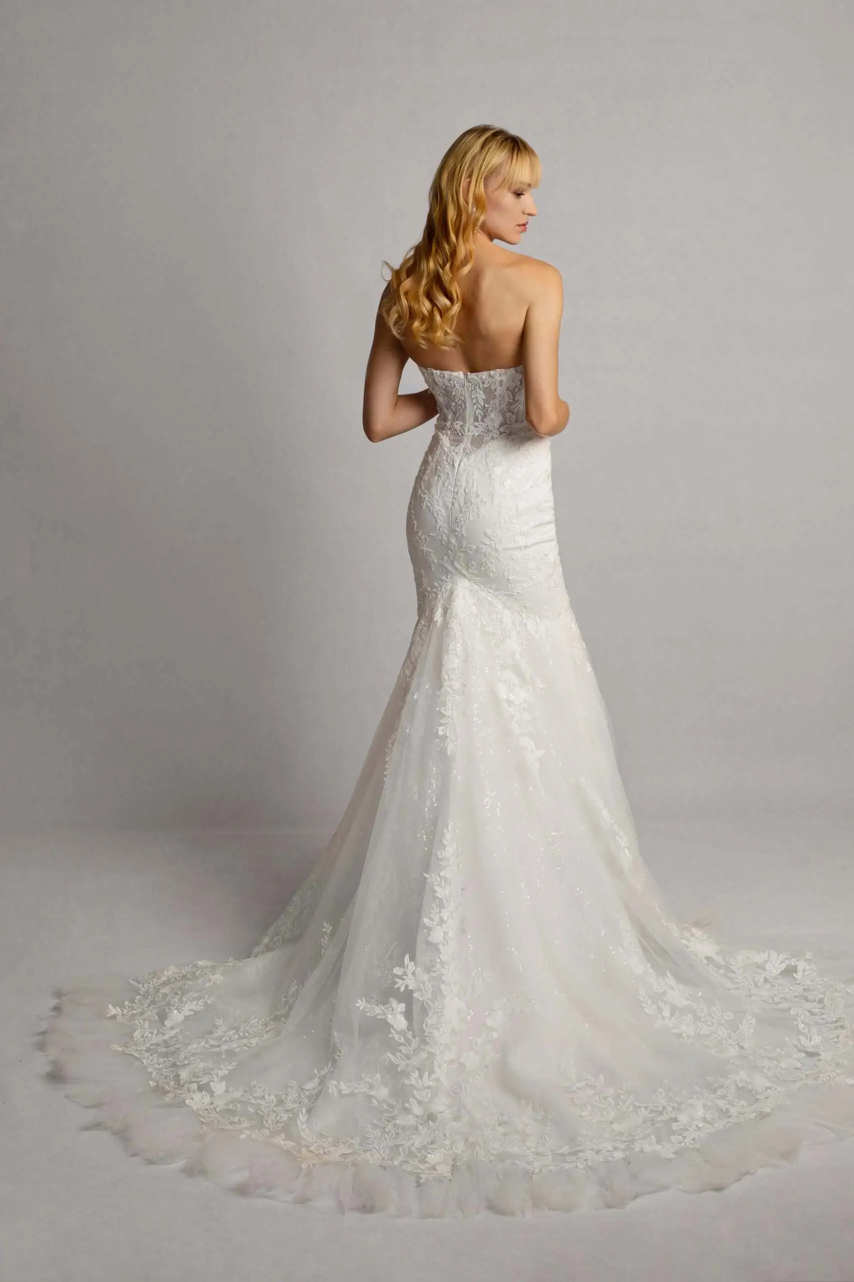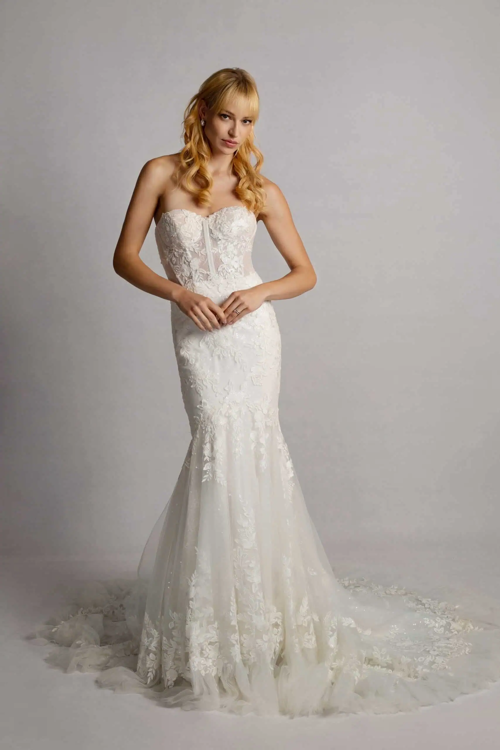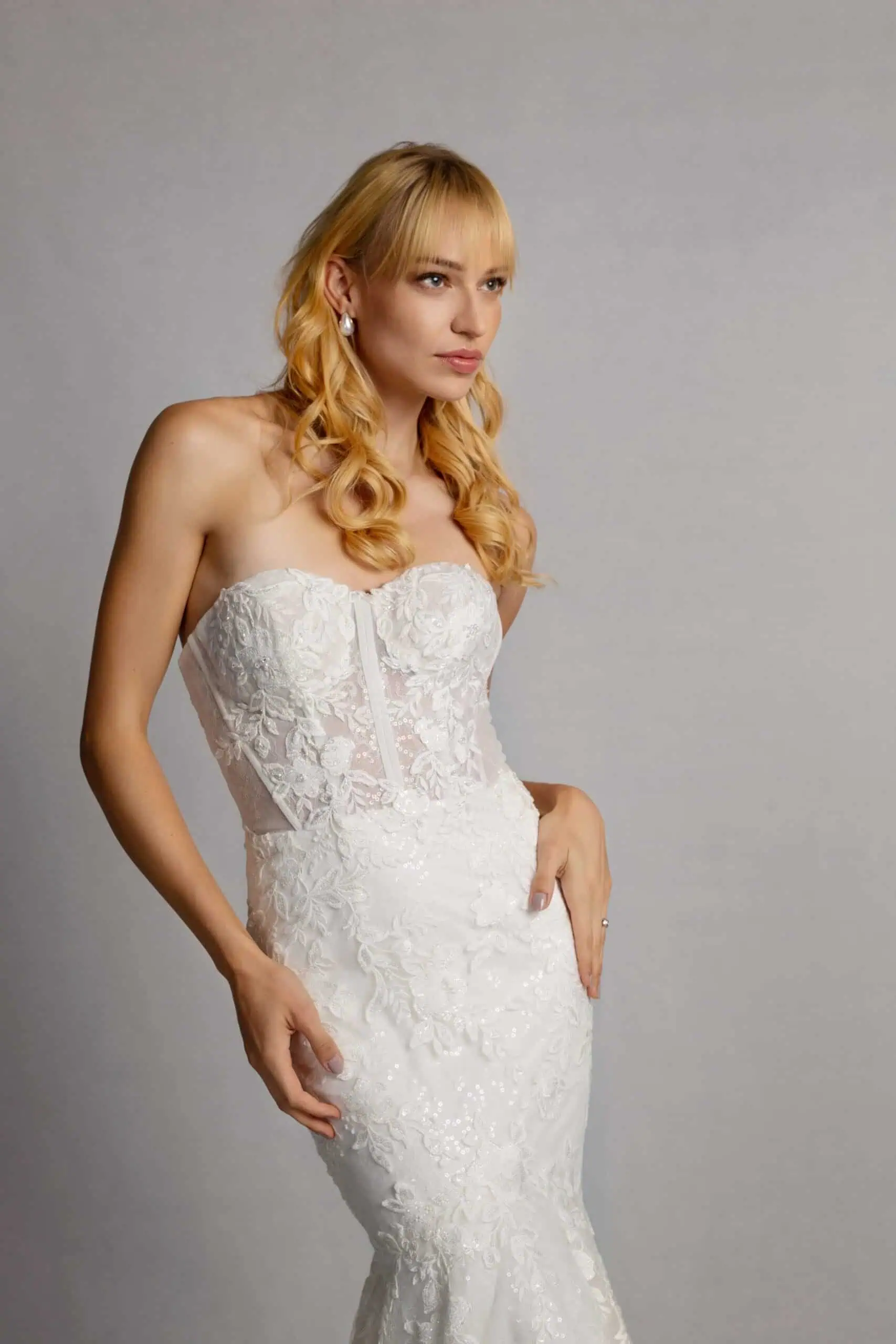 A stunning strapless fit-and-flare gown with an ivory illusion bodice, twinkling sequins, and intricate floral appliqué. The gathered hem frill adds movement, and the matching veil enhances its elegance