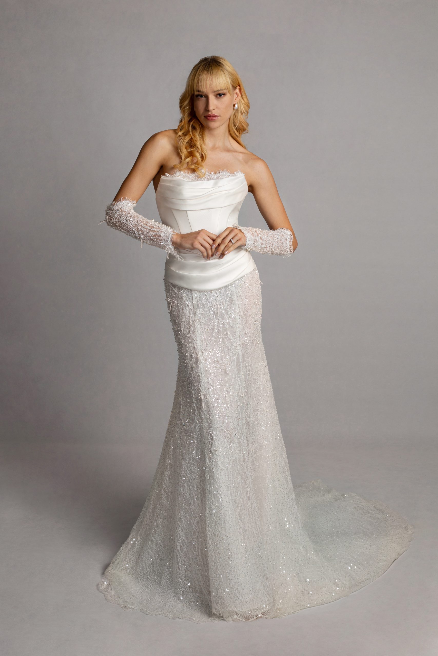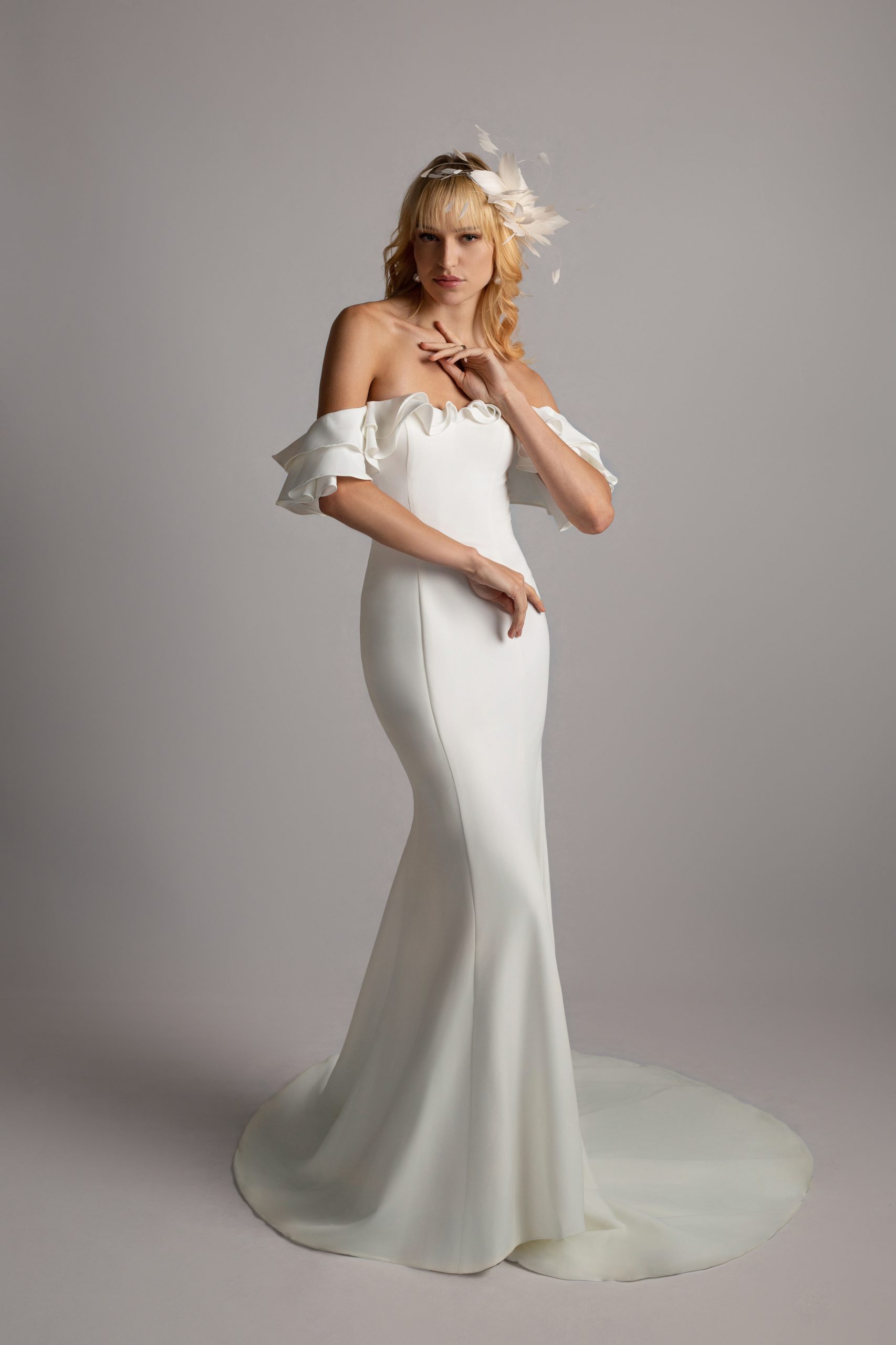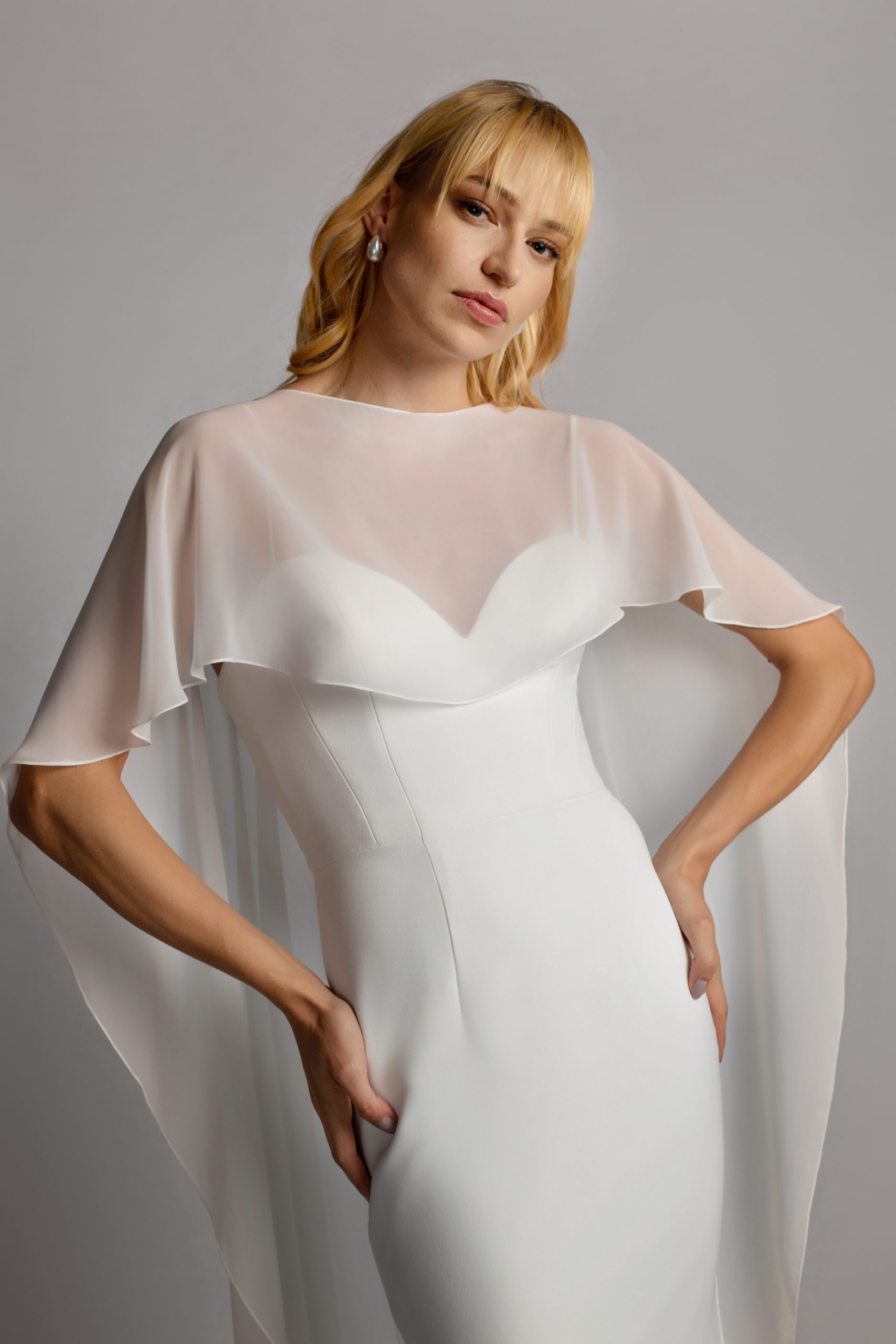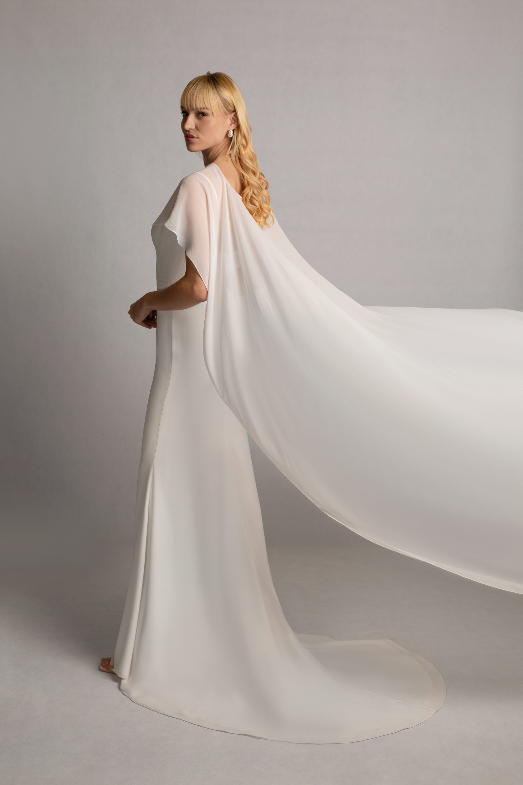 Designed for both structure and grace, this crepe fit-and-flare gown features a luxe interior lining, built-in corsetry, and a delicate chiffon cape