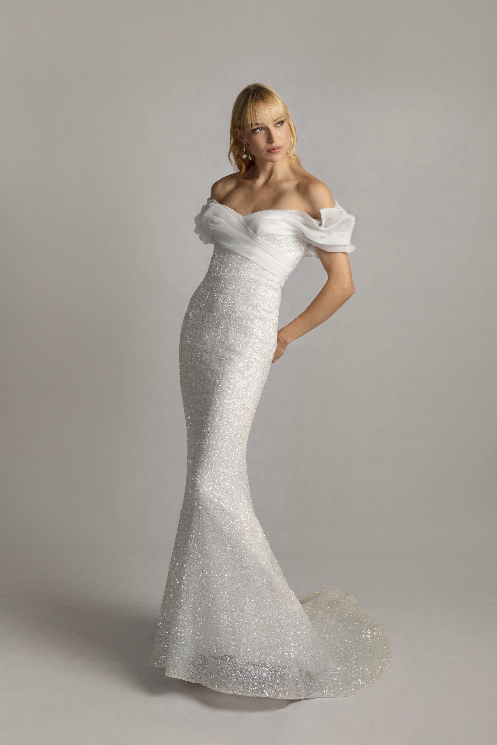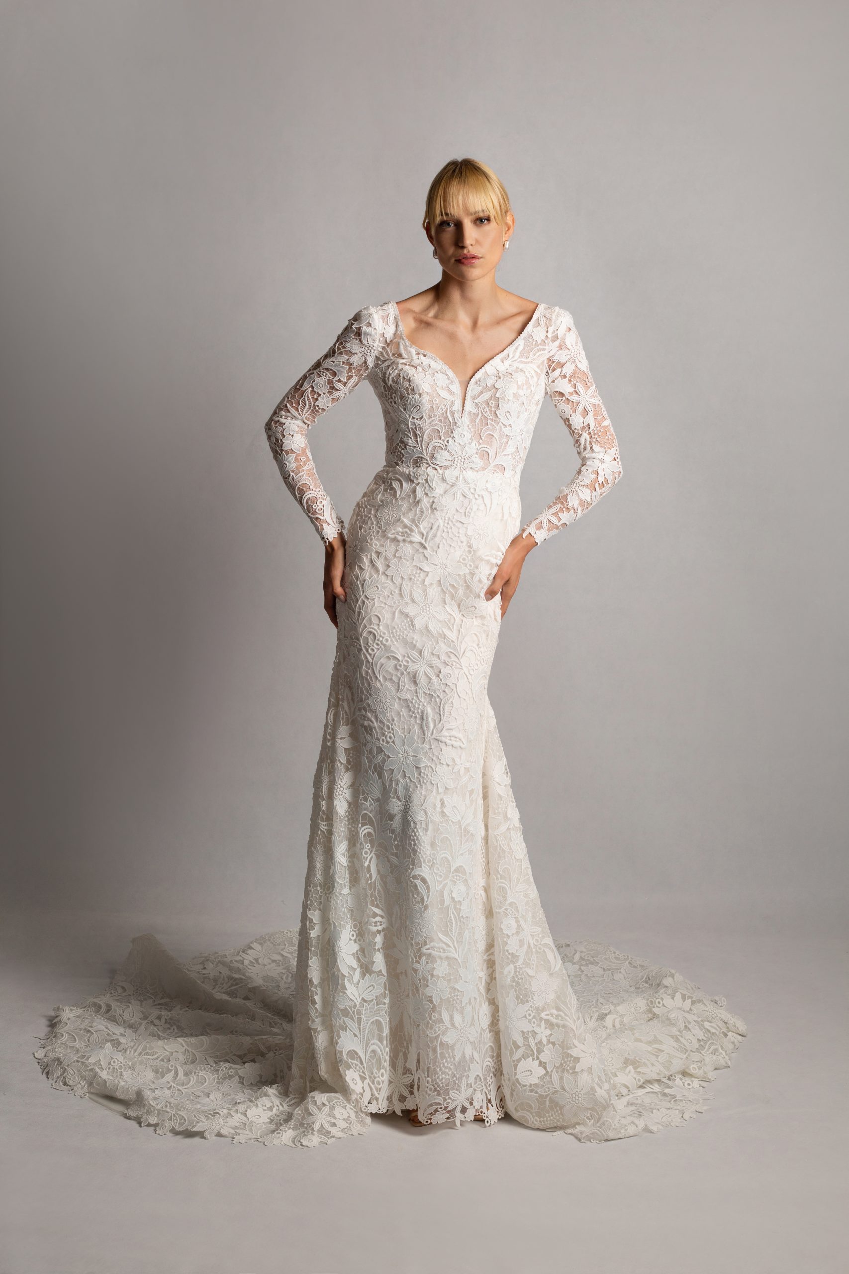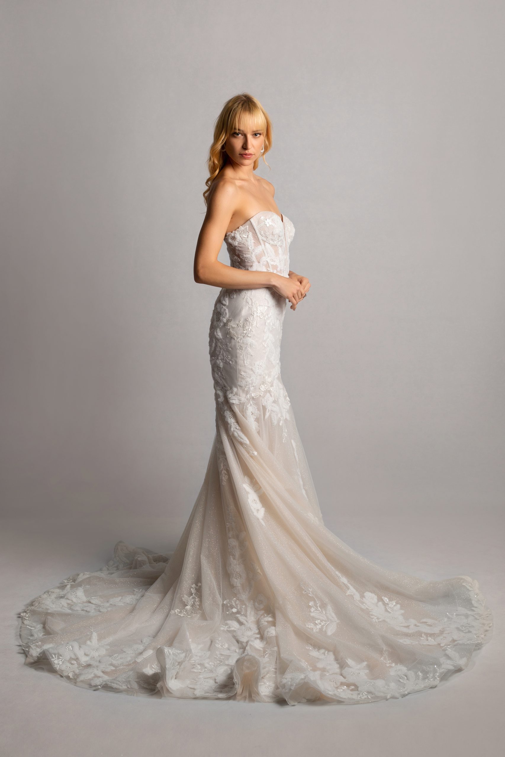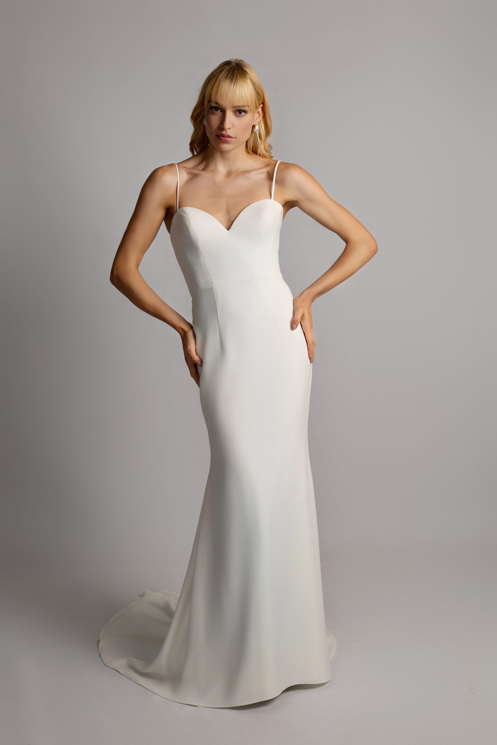 Designed for both structure and grace, this crepe fit-and-flare gown features a luxe interior lining, built-in corsetry, and a delicate chiffon cape