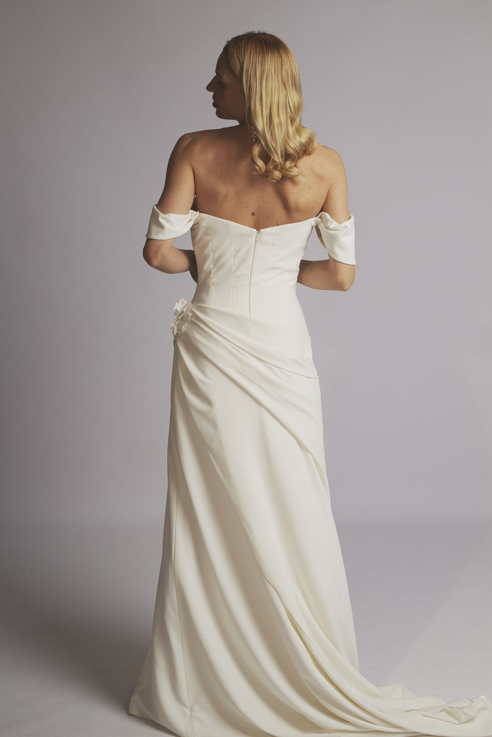 Crepe off the shoulder drop waist fully boned bodice with a flattering draped skirt and split