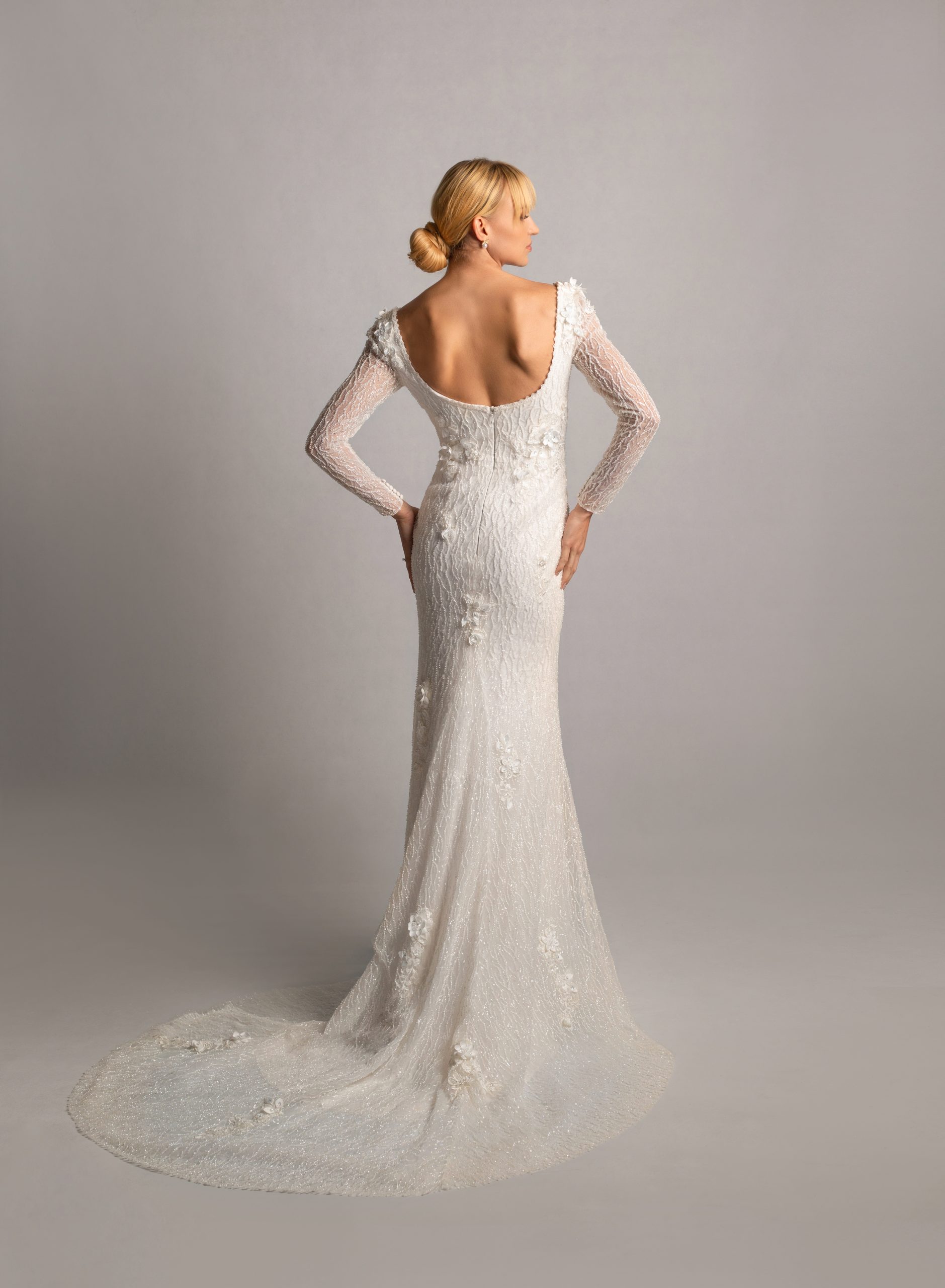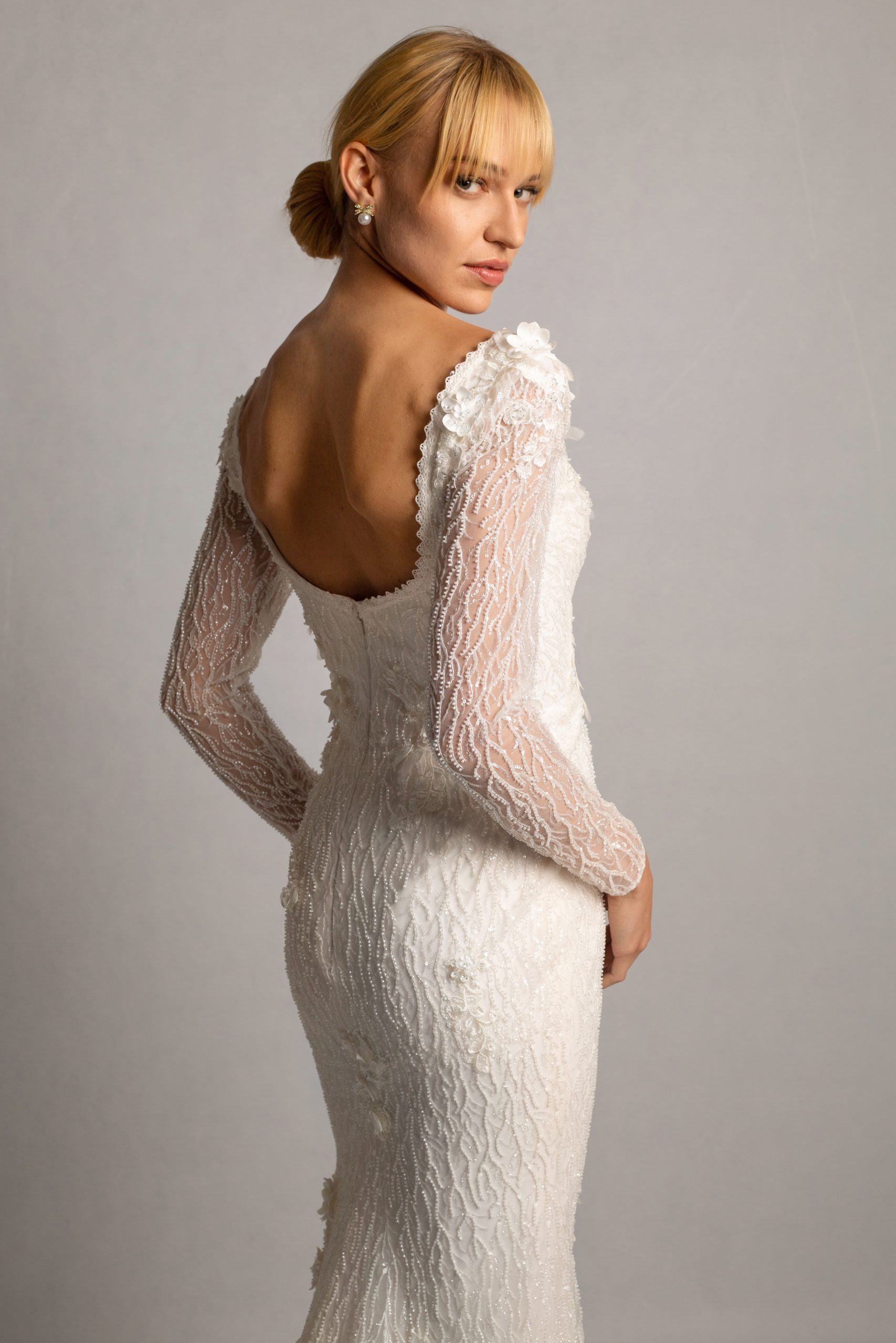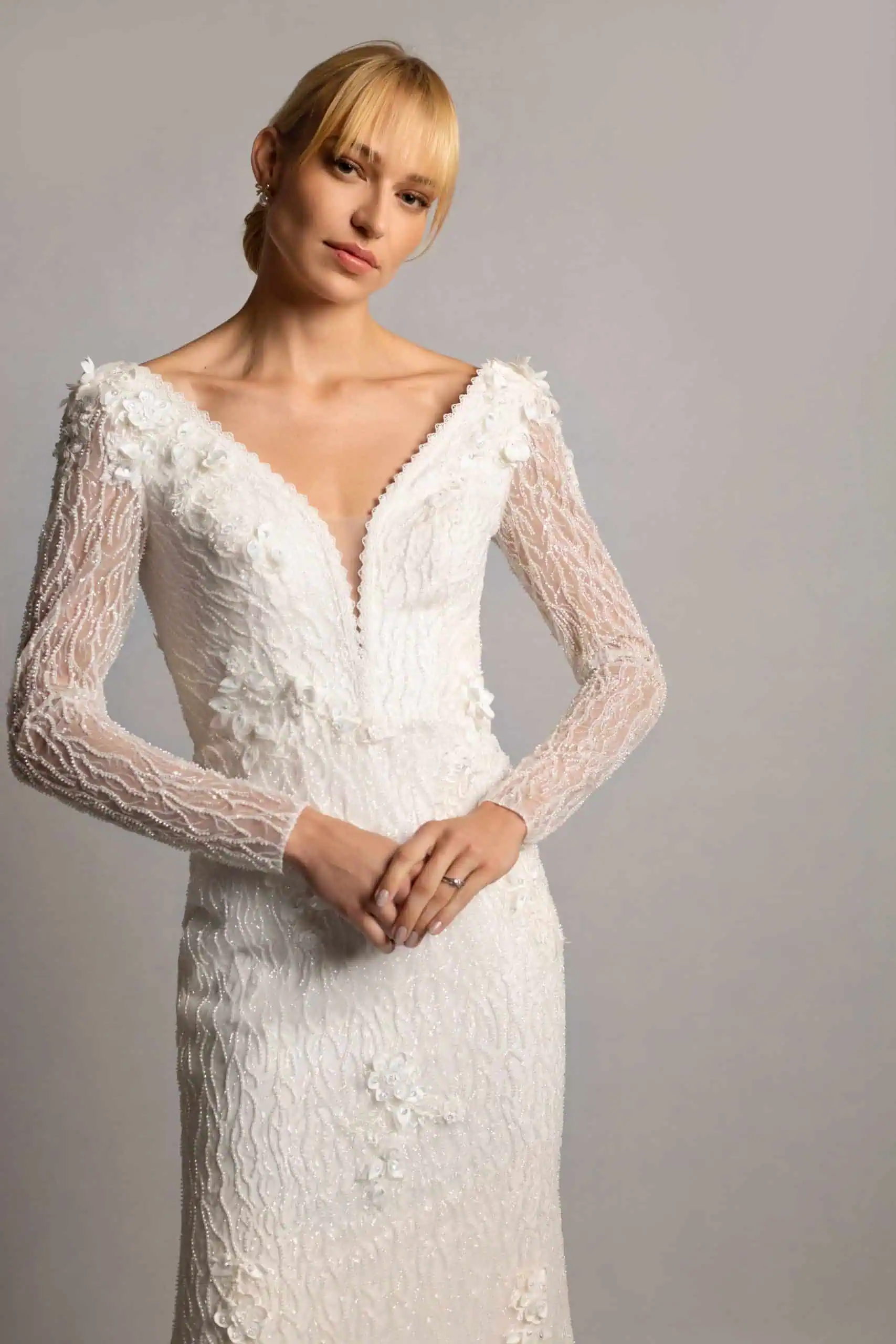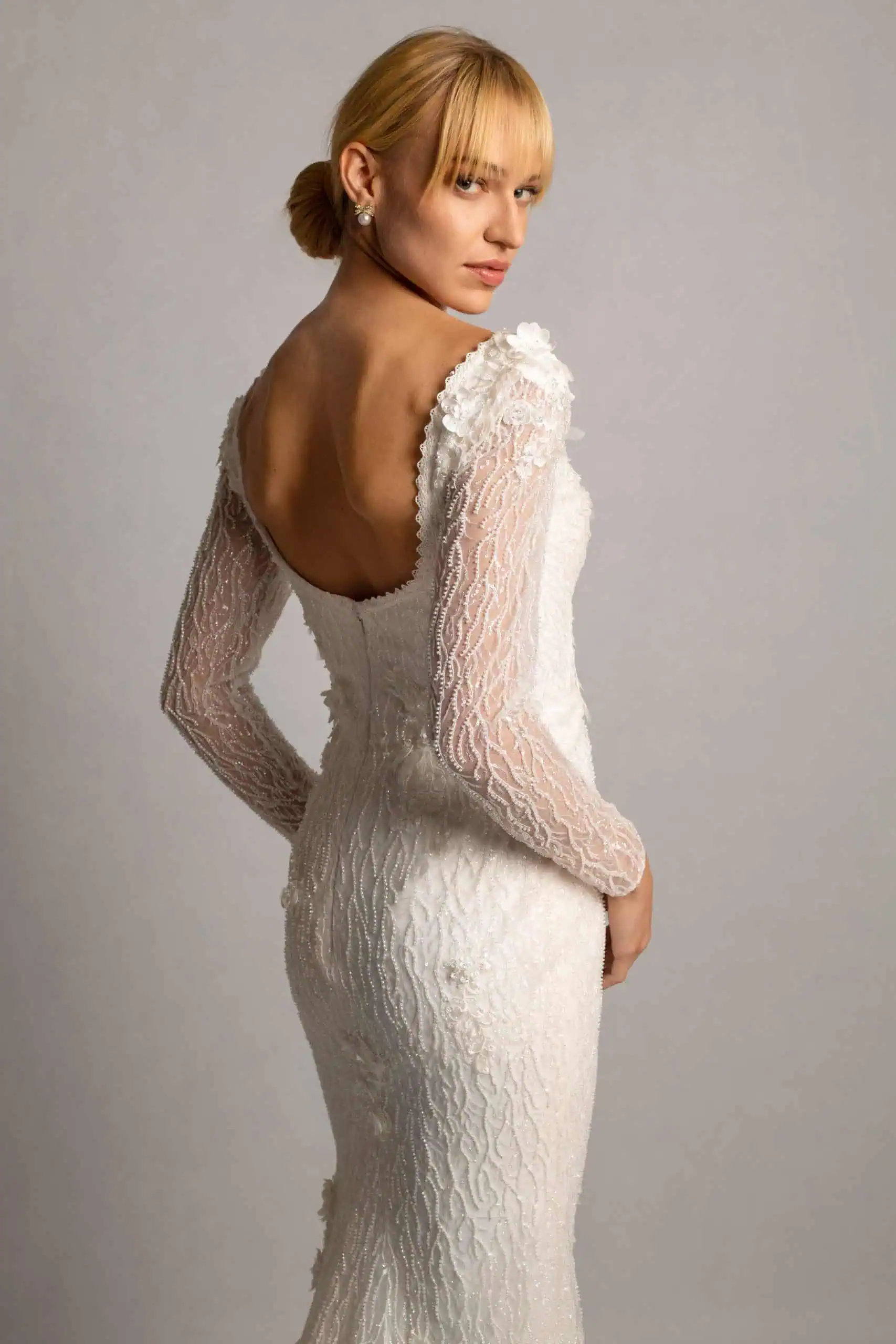 A striking all-over beaded gown with a sleek straight silhouette, featuring delicate 3D floral accents and long sleeves, designed with a daring low neckline and open back for a modern, romantic look