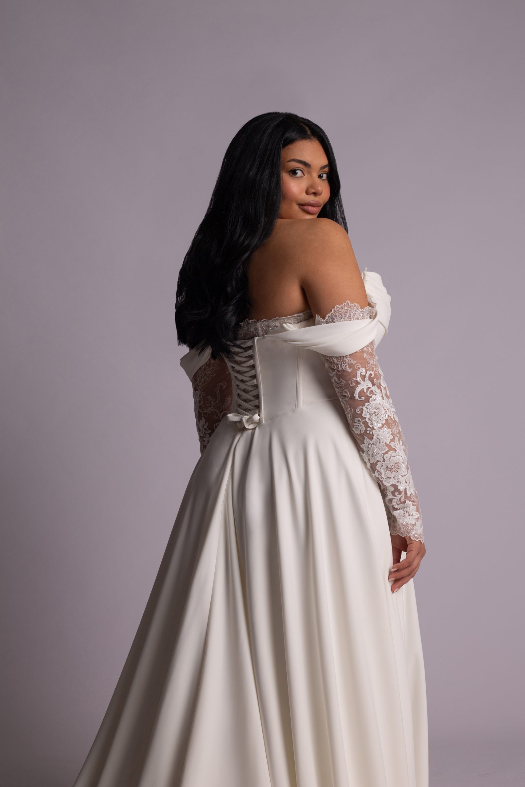 Structured corseted crepe bodice with peeping lace on the bustline, lace split, detachable gloves and sleeve, and a full circle skirt