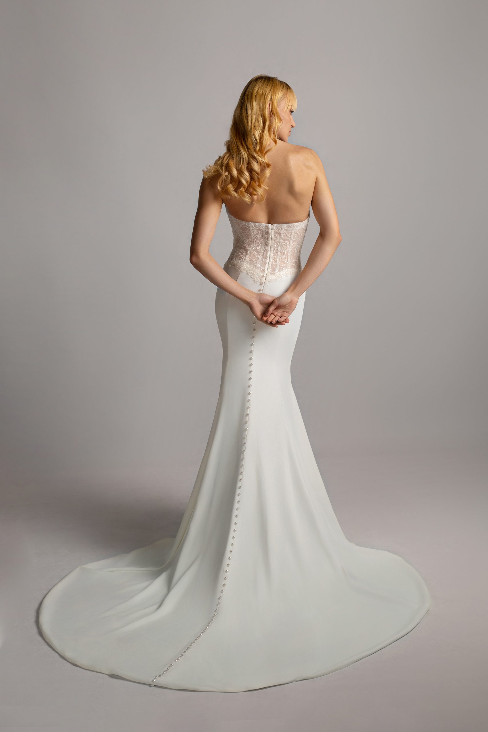 Sophisticated crepe pleats define this straight gown, beautifully accented with rose-patterned beaded illusion panels along the sides and back, and finished with draped pearls