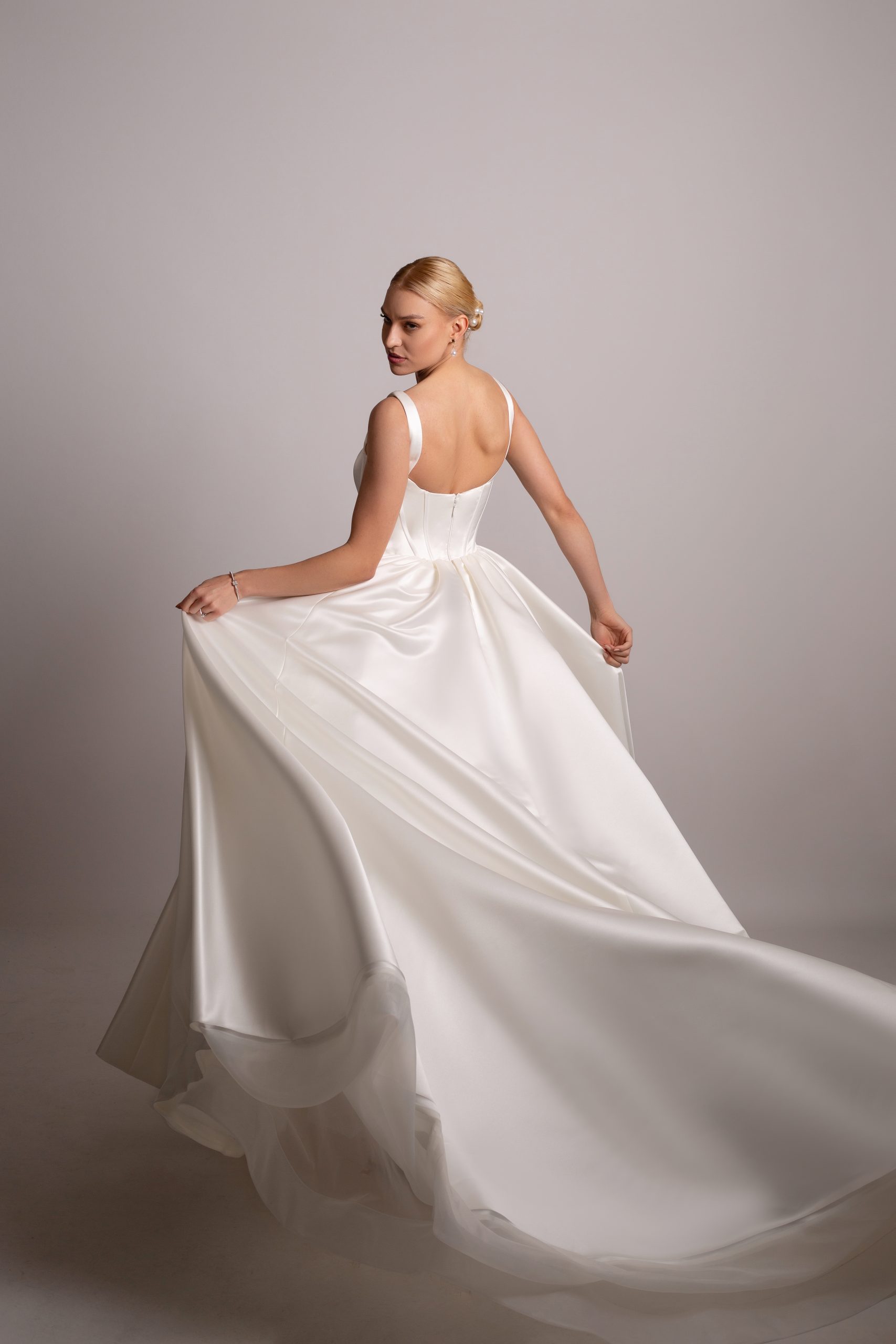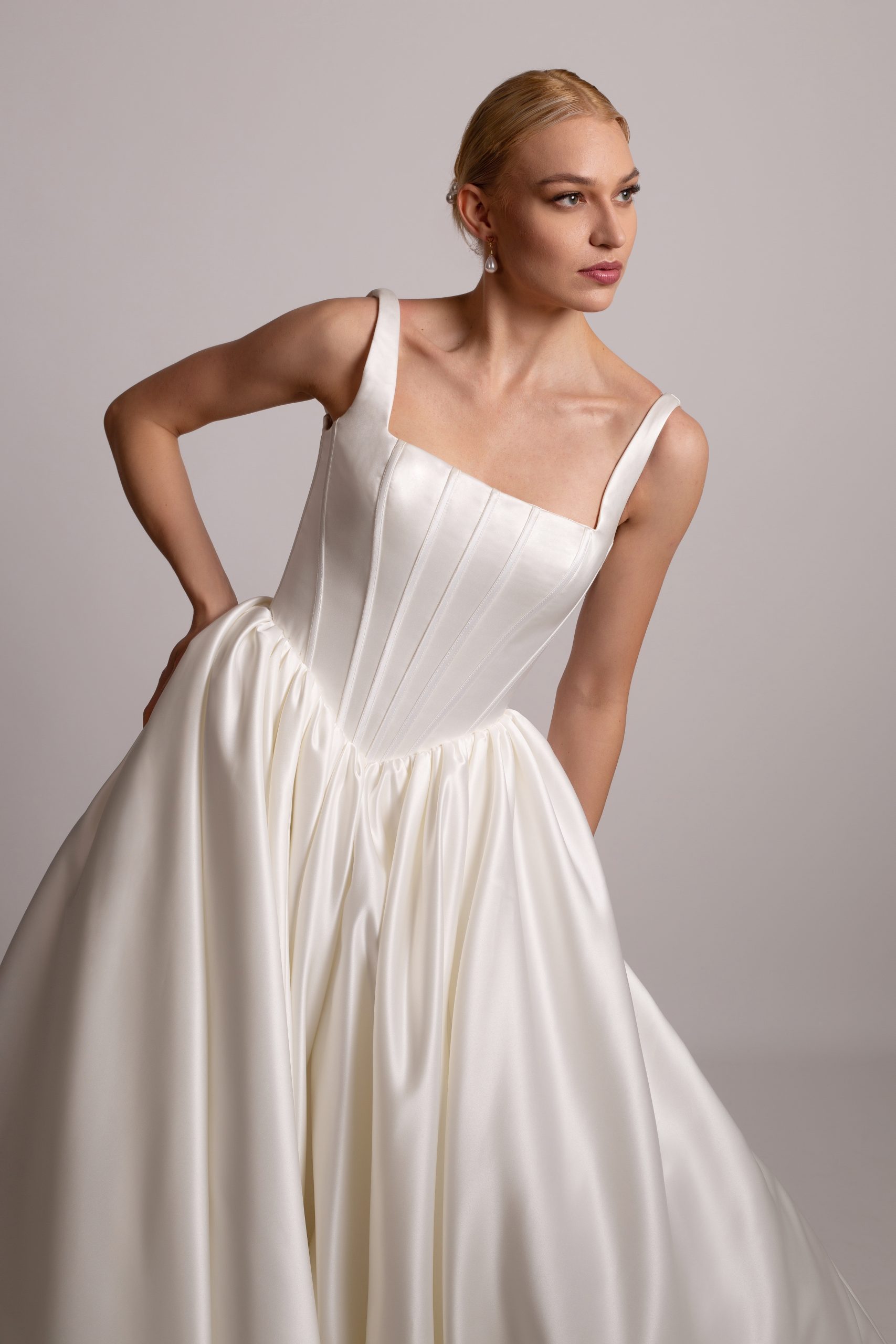 Smooth satin bodice with exposed corset boning and thick flattering straps, cascading into a full A line skirt.