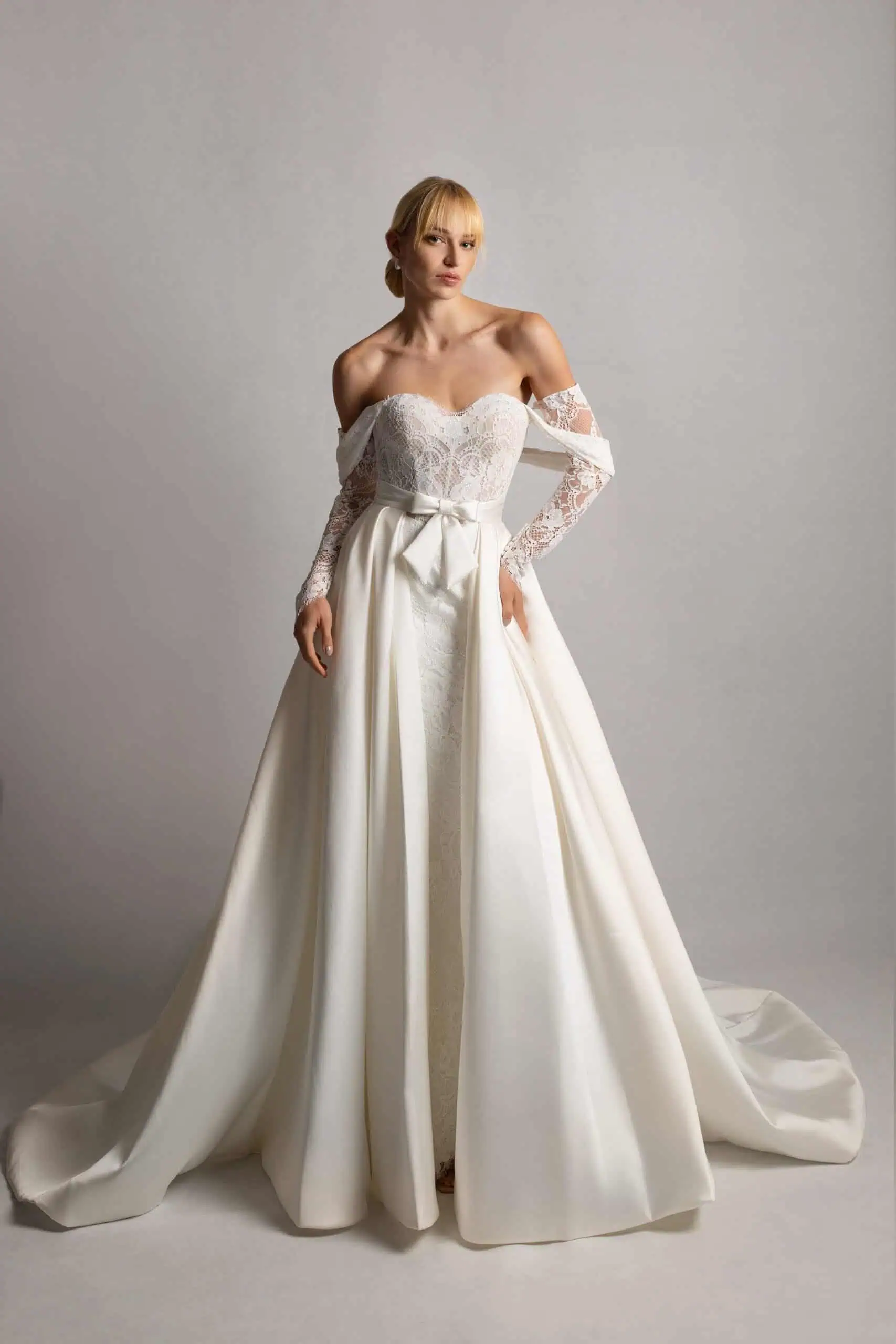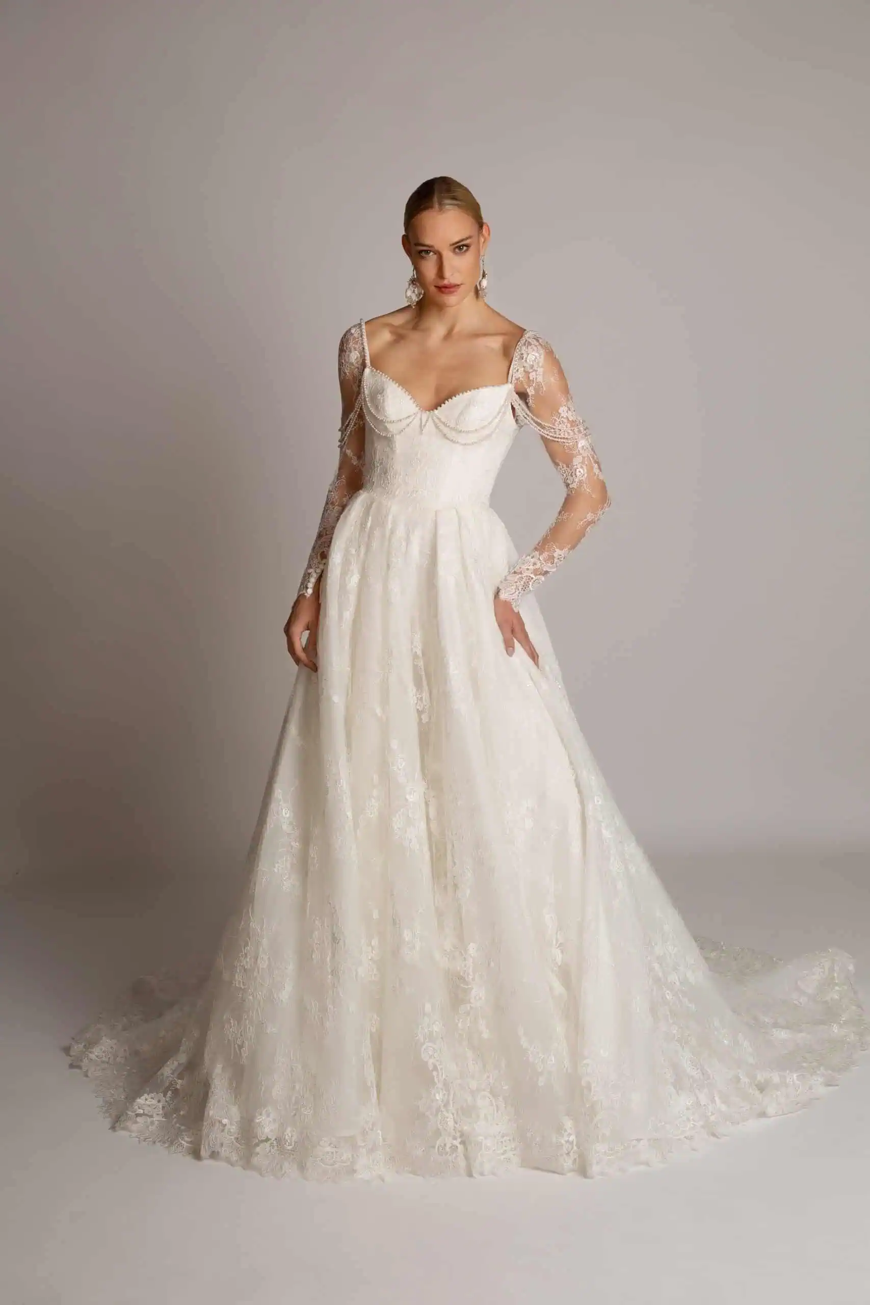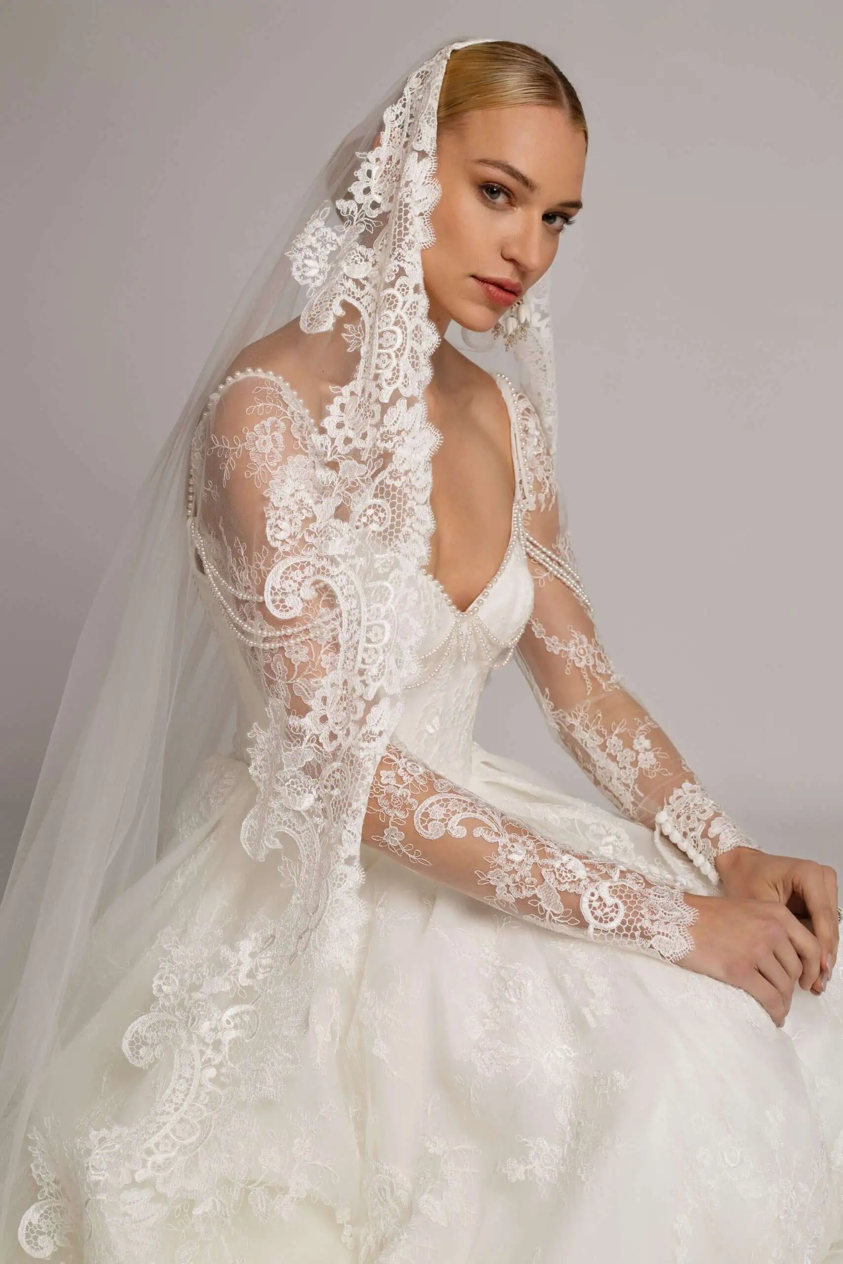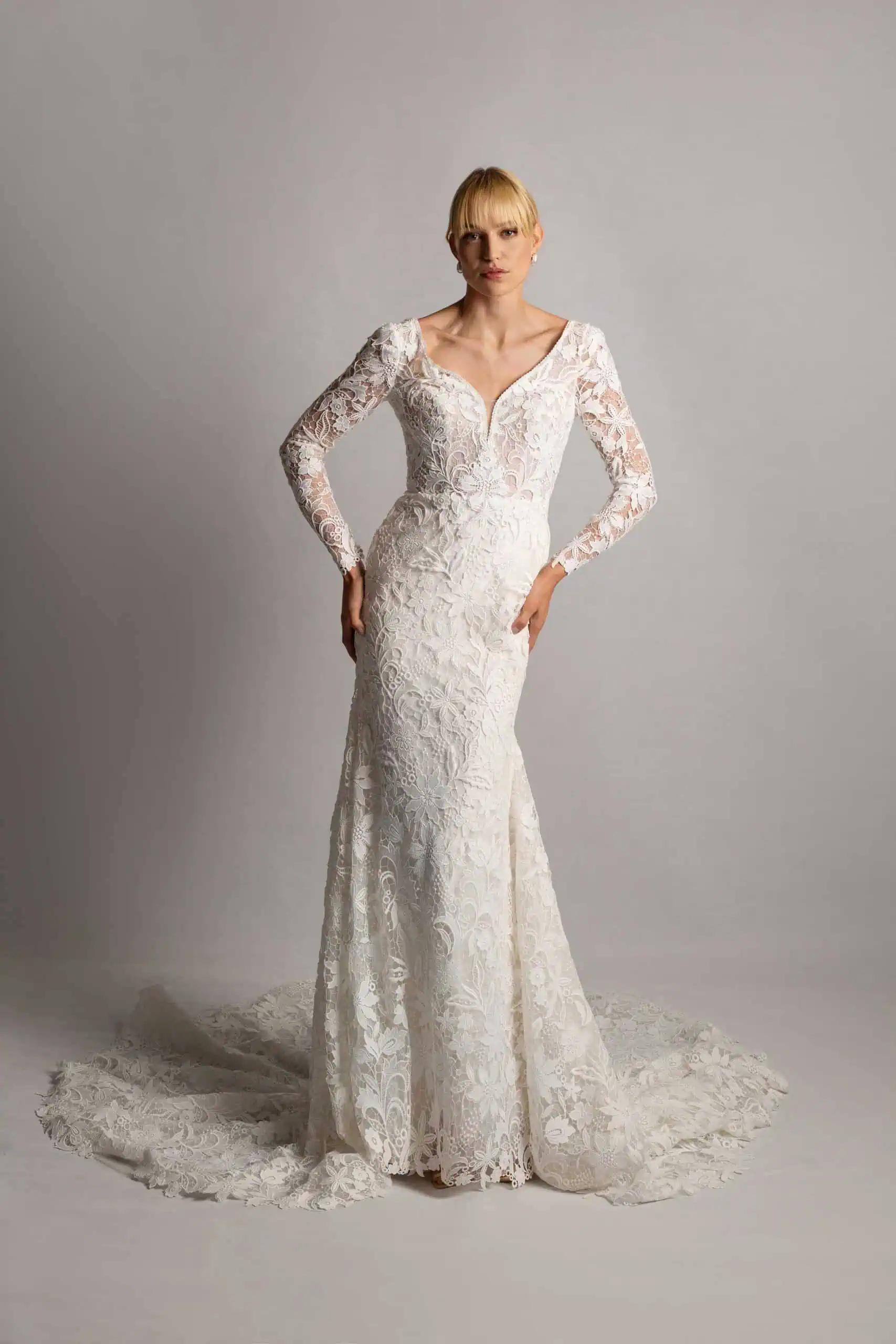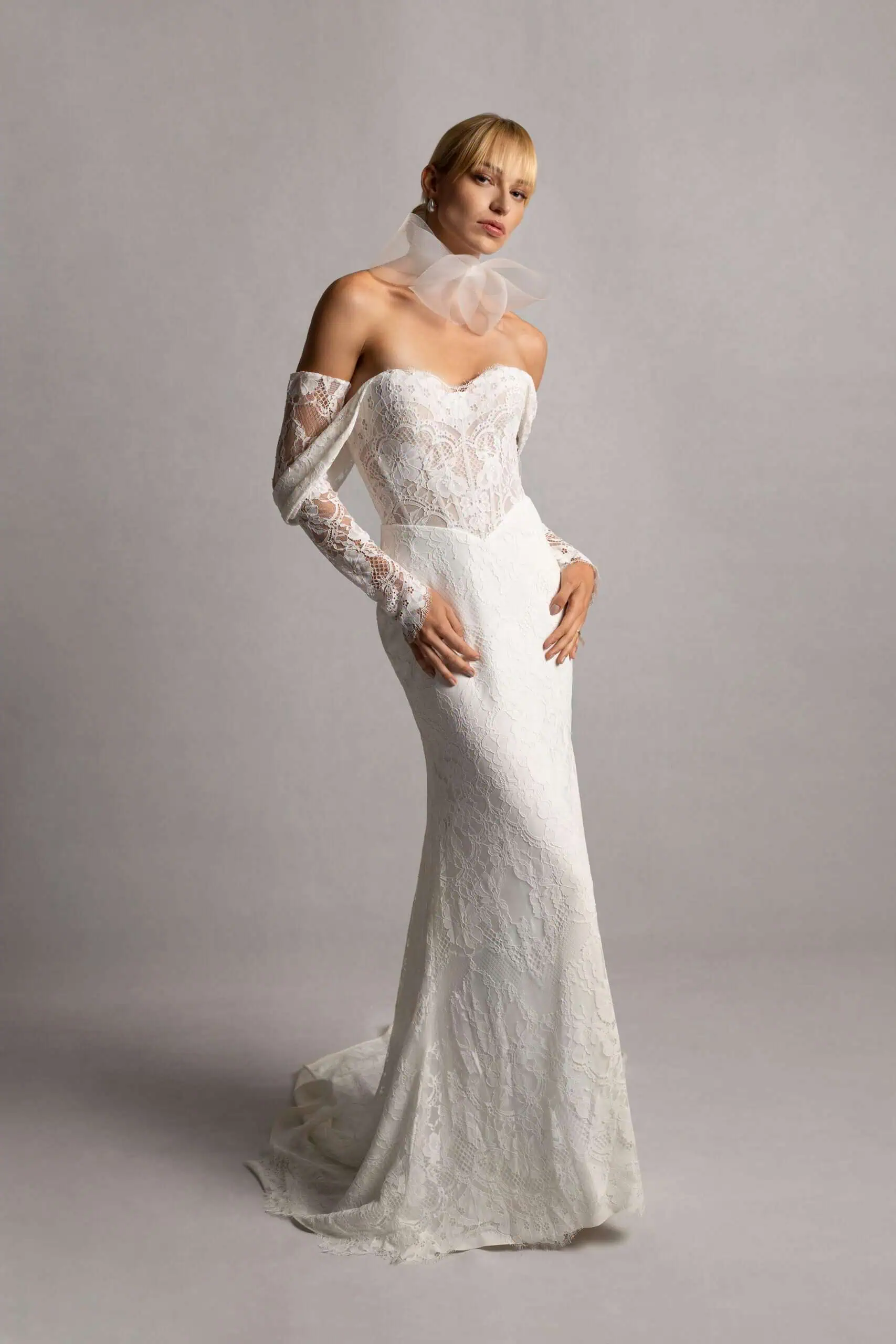 Crepe fit and flare gown with a sweetheart neckline. Illusion lace sleeves and back with a cut out train.