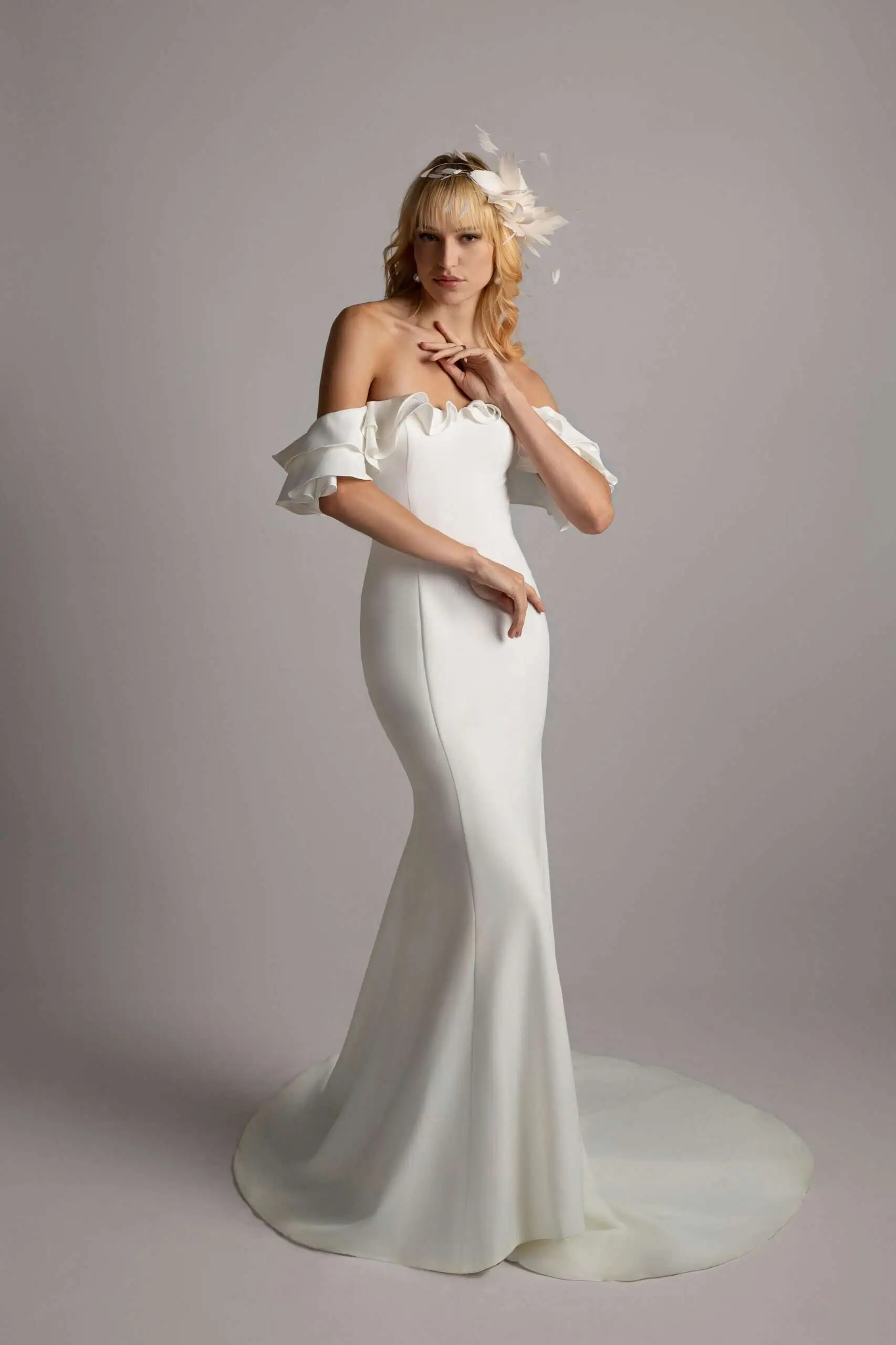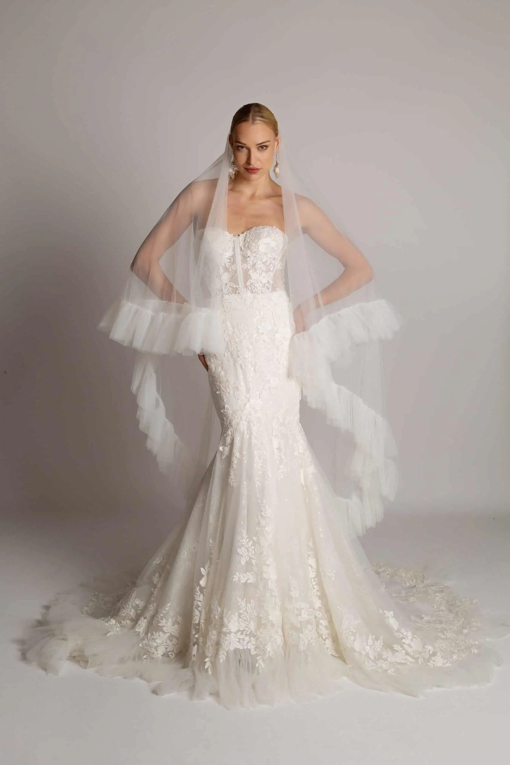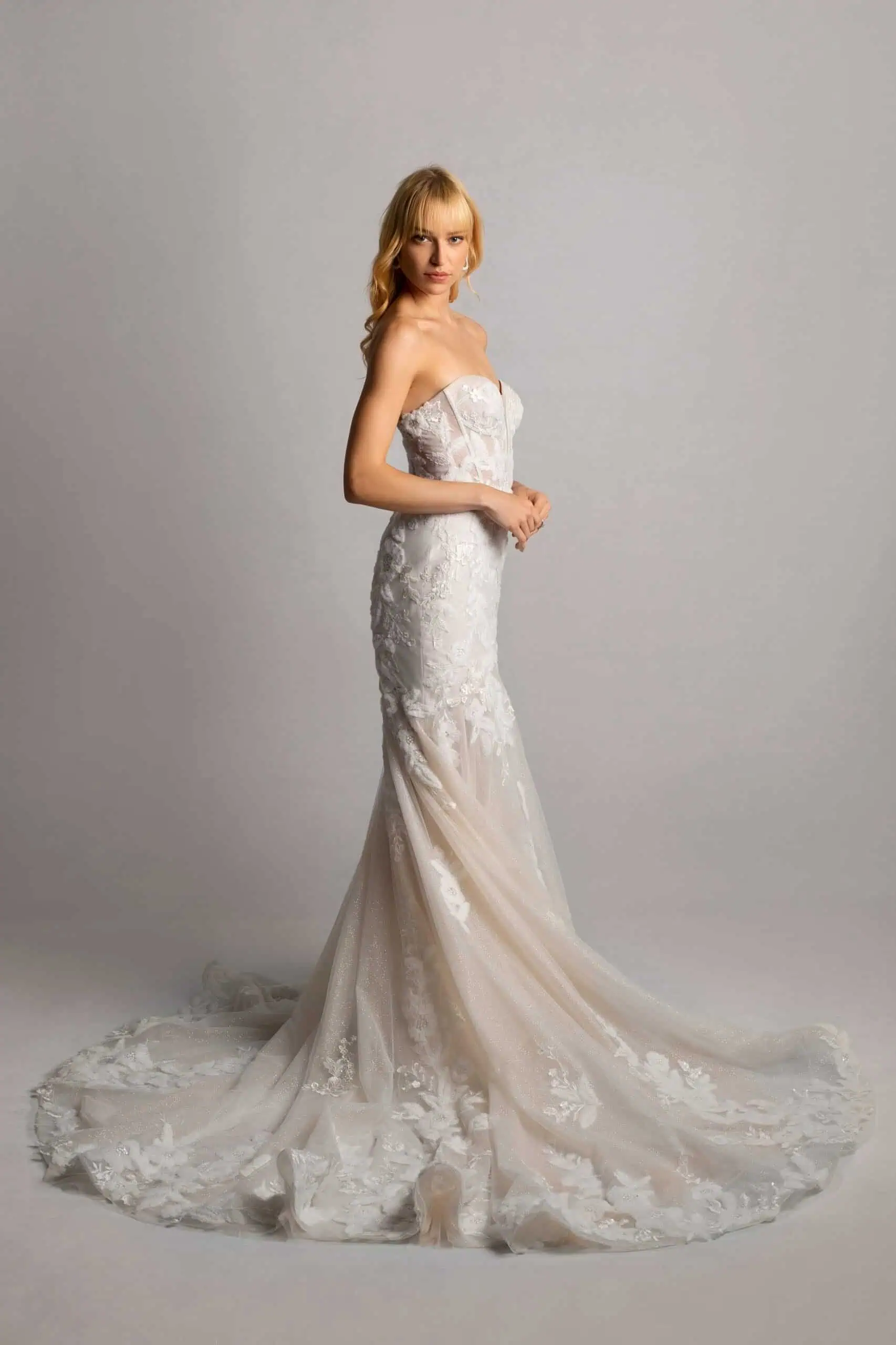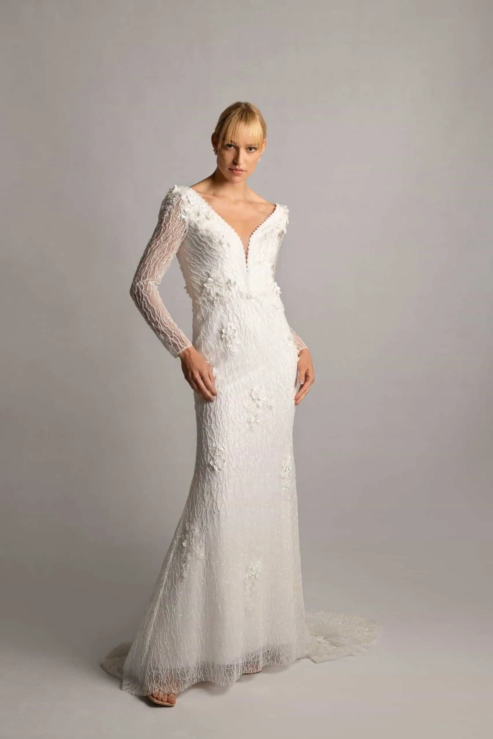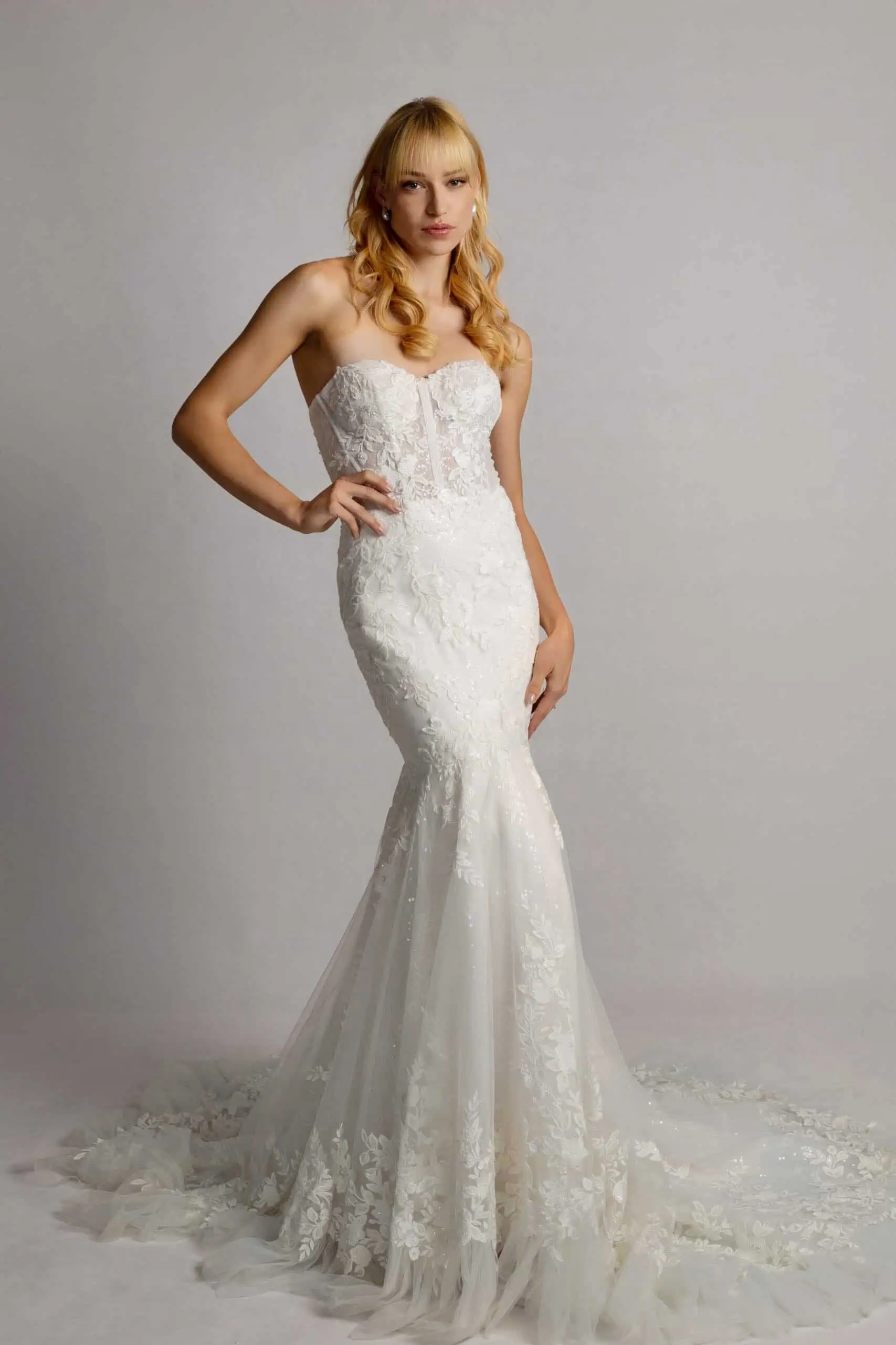 Crepe fit and flare gown with a sweetheart neckline. Illusion lace sleeves and back with a cut out train.
