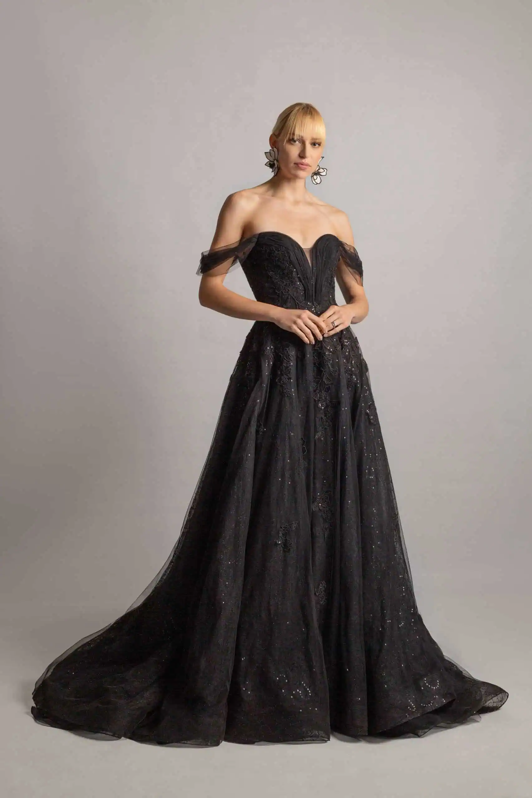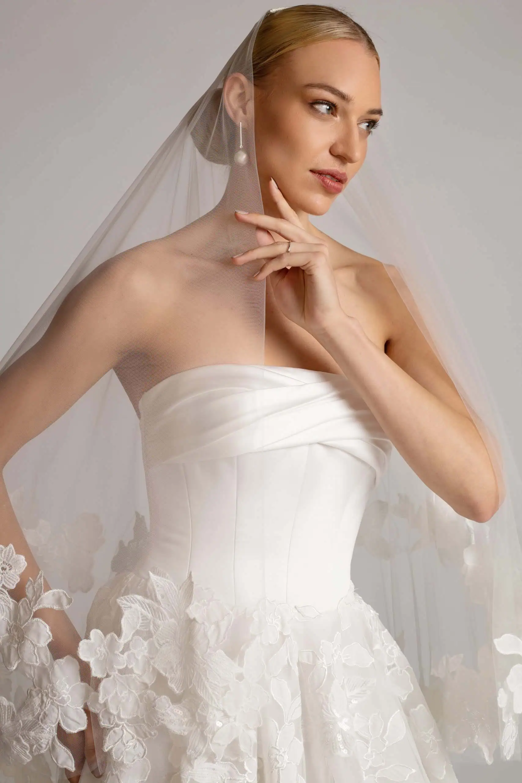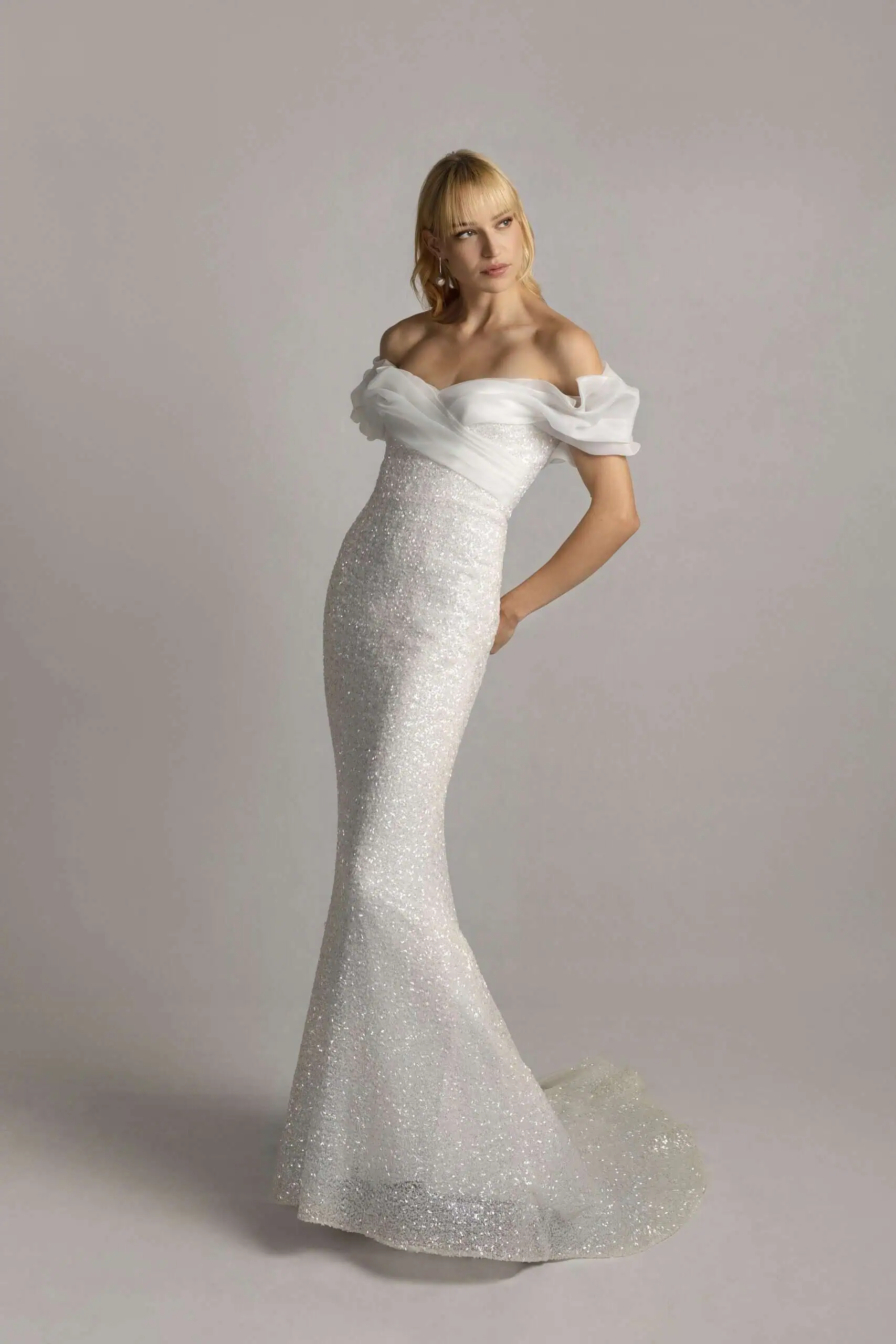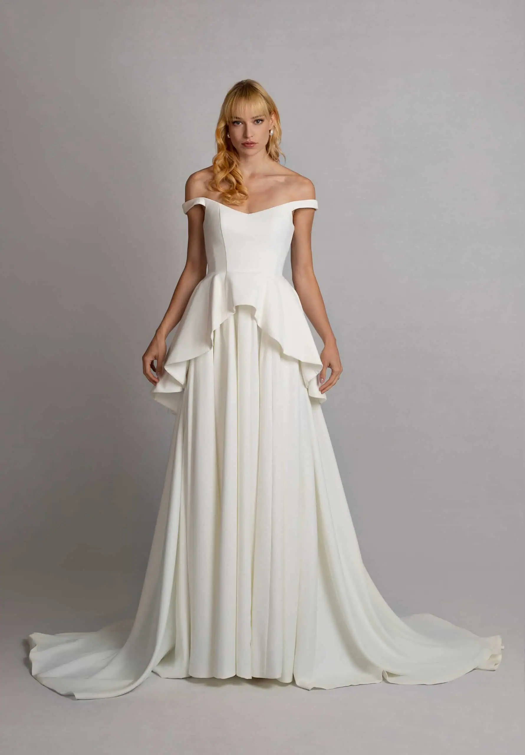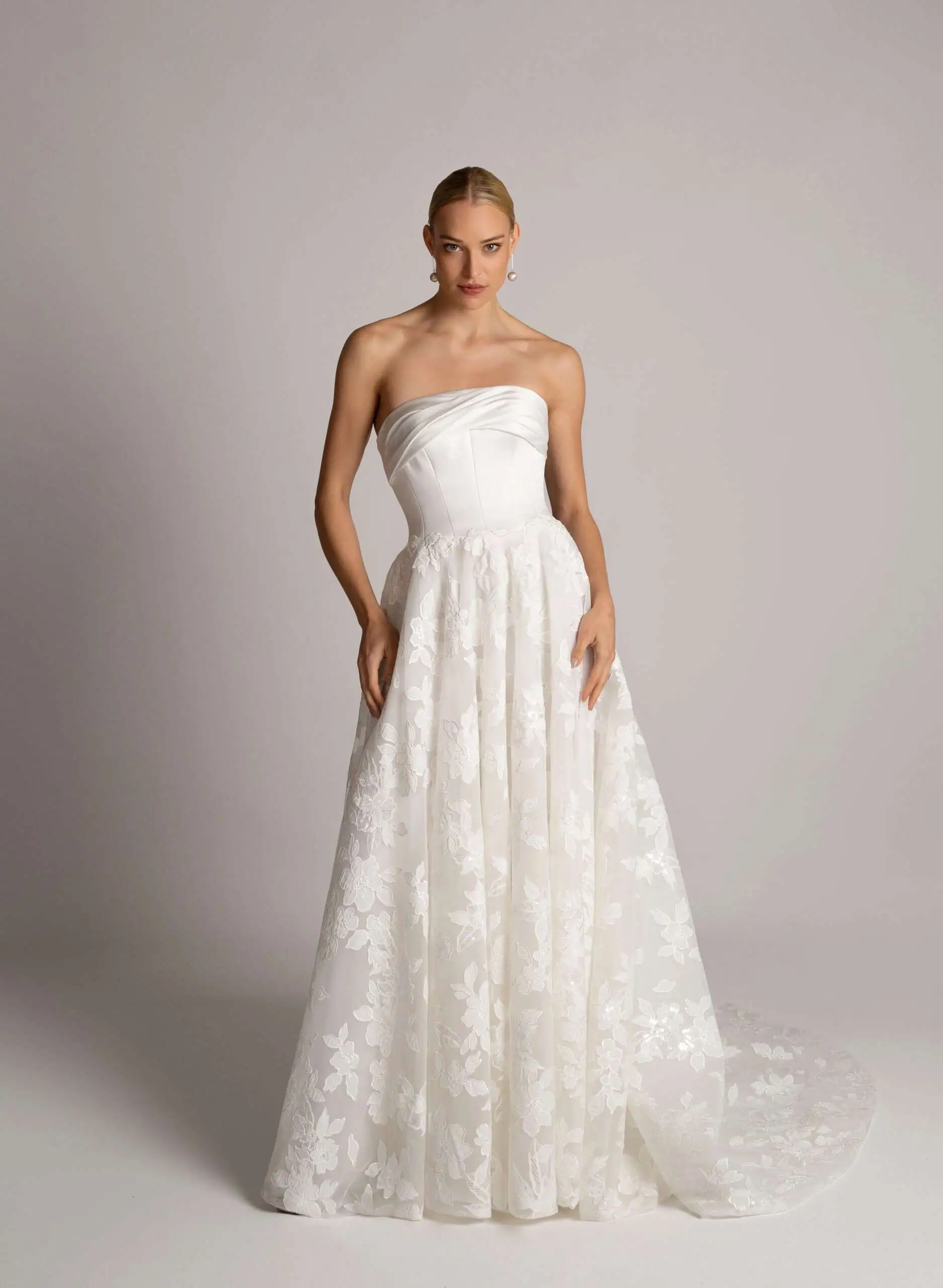 Crepe fit and flare gown with a sweetheart neckline. Illusion lace sleeves and back with a cut out train.