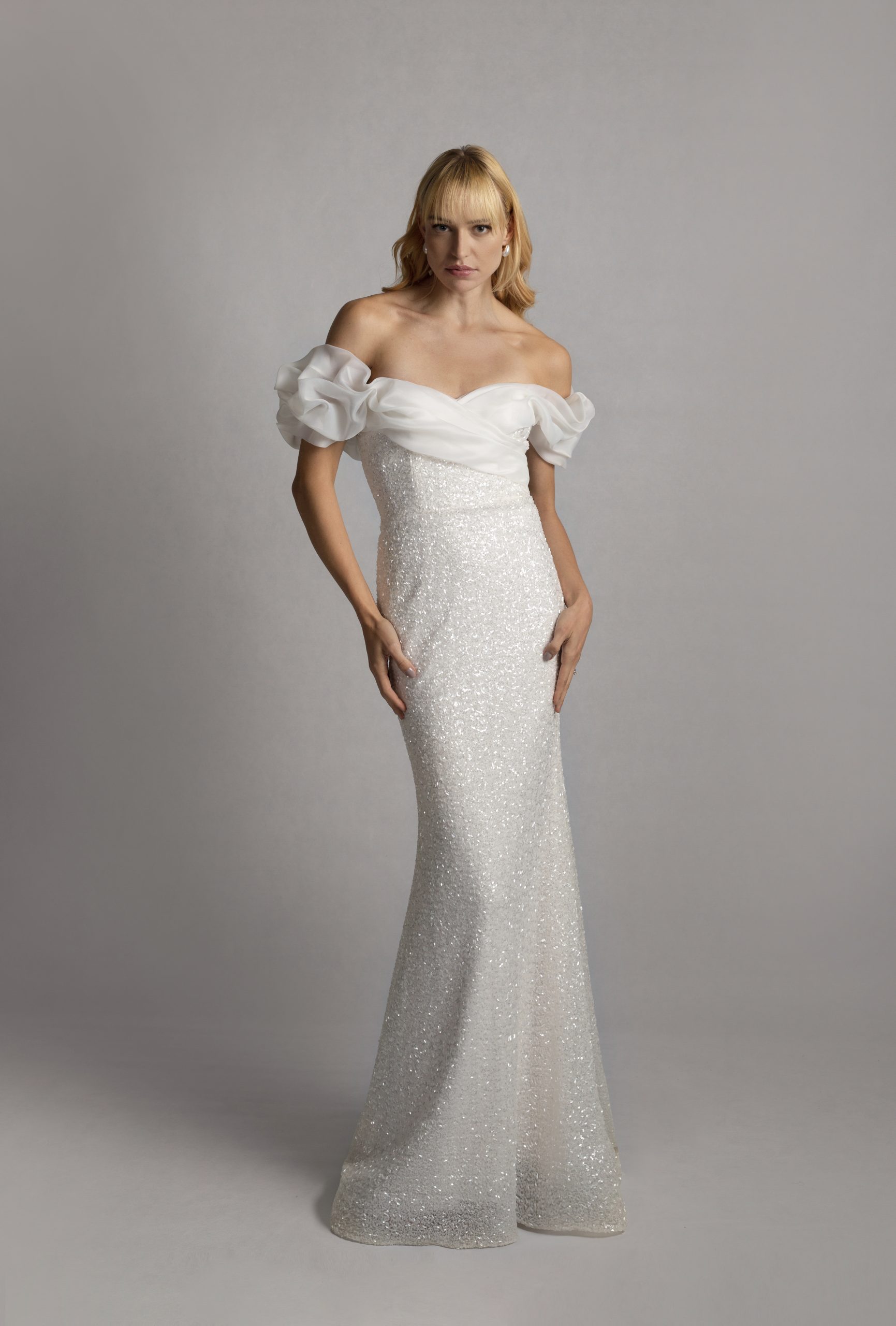 A glamorous, evening-inspired gown featuring a straight silhouette with soft sequin sparkle throughout and finished with a crossover organza Bardot neckline for an effortlessly elegant touch
