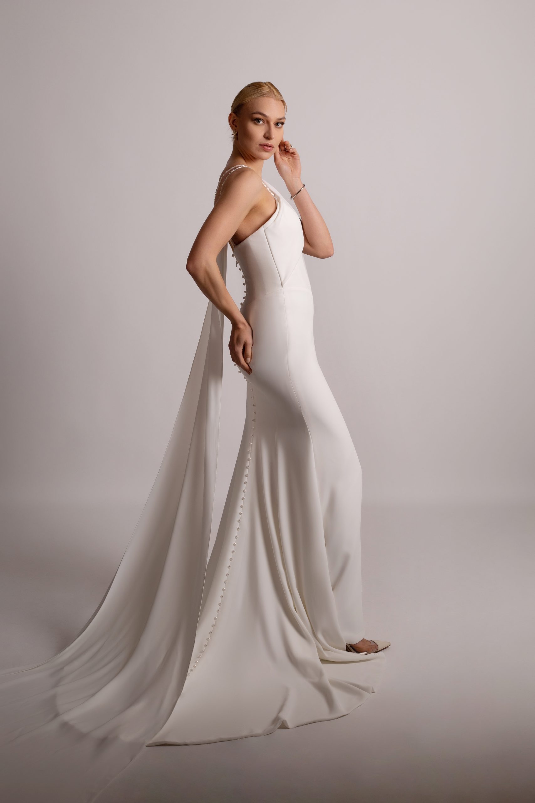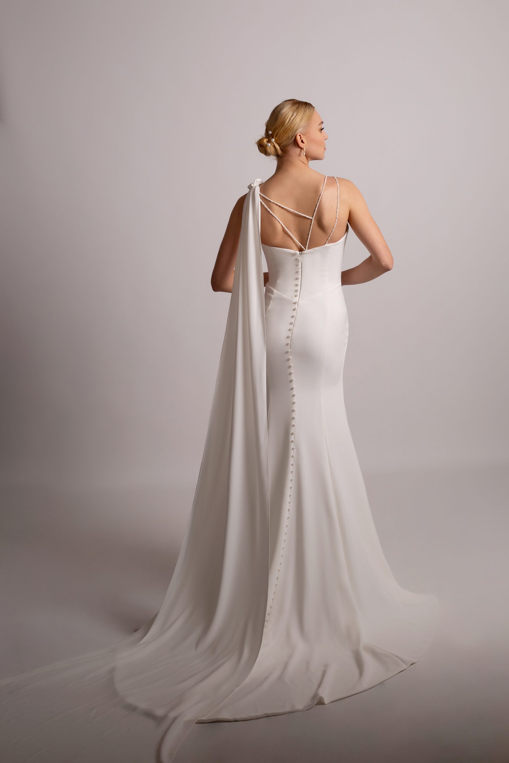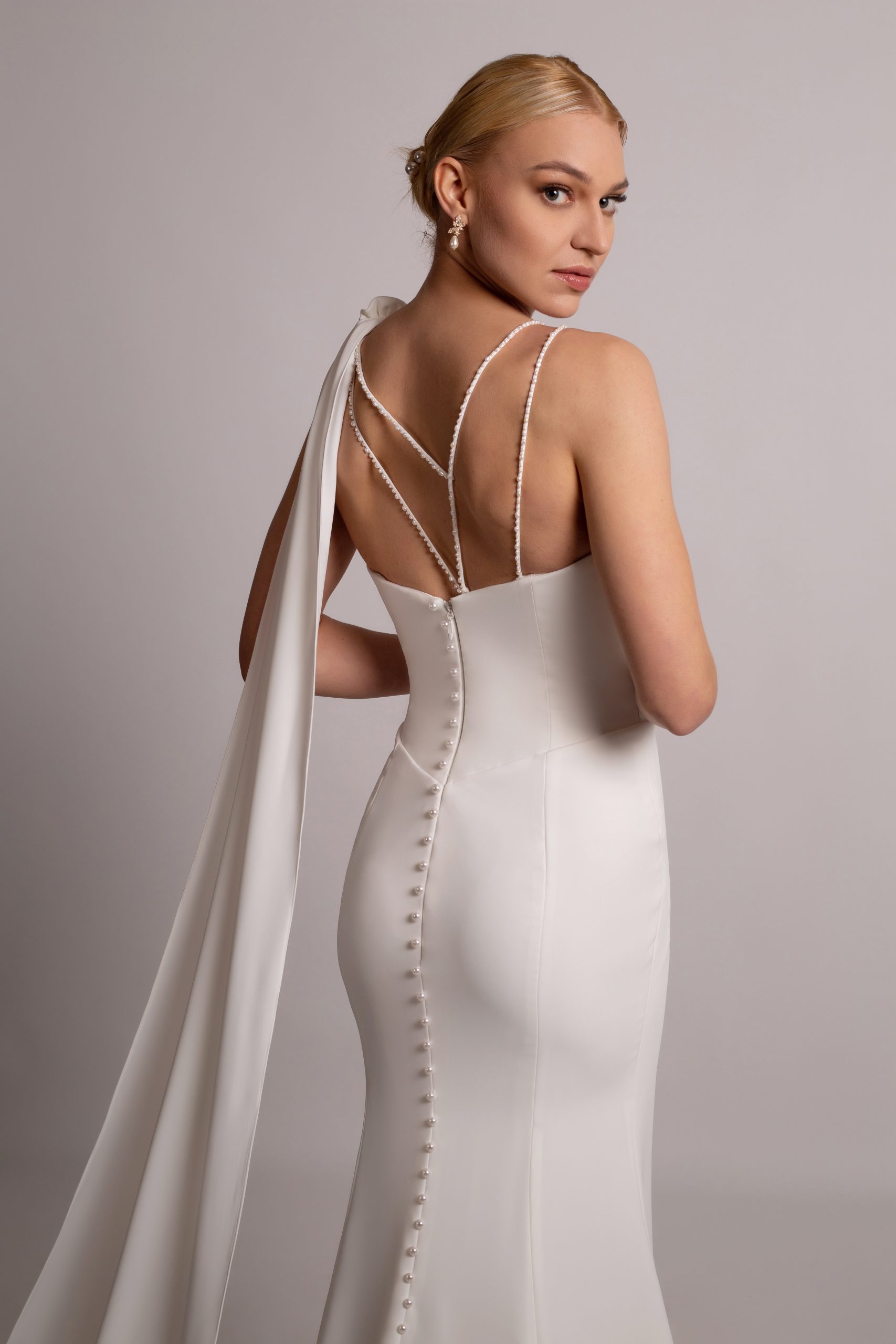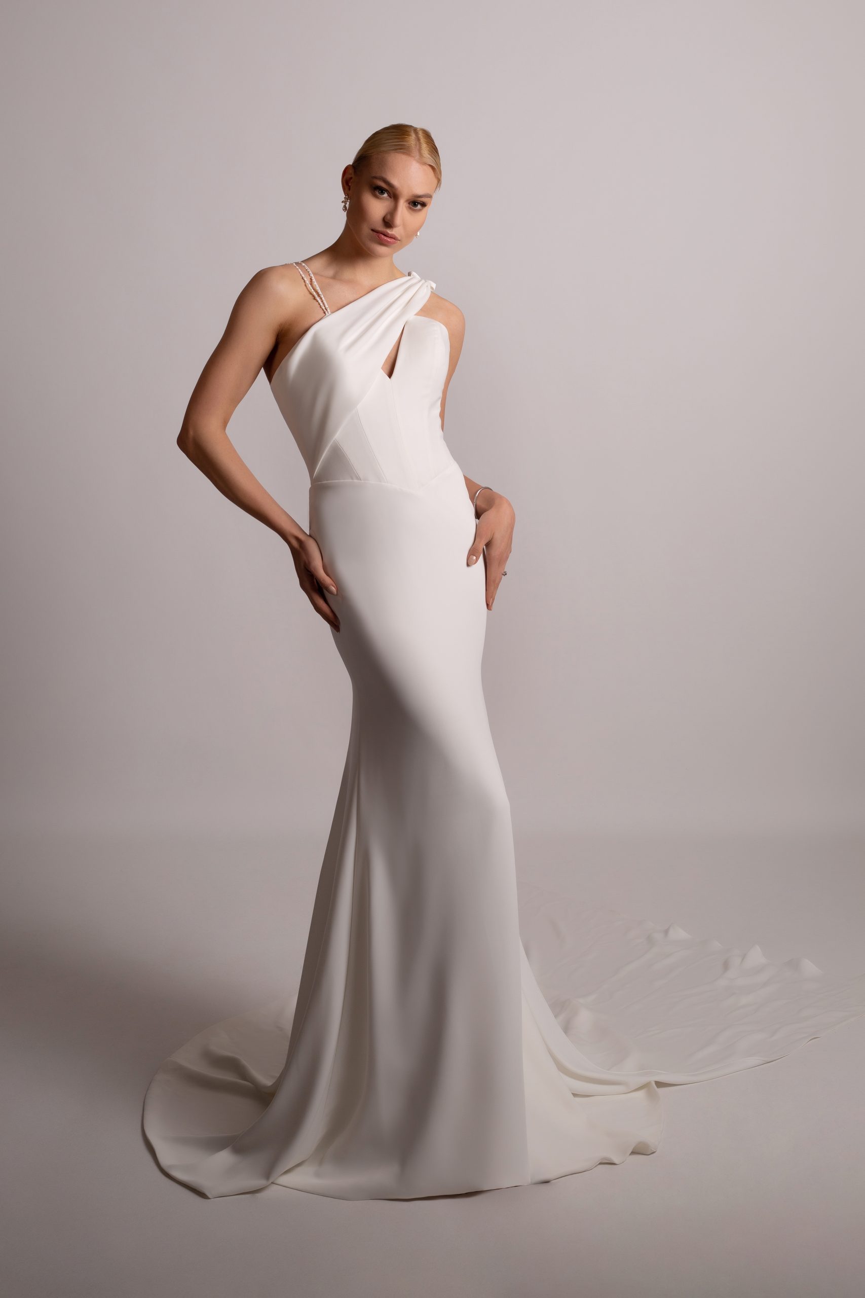 The asymmetrical neckline and sculpted bodice creates a contemporary feel to the gown. The fitted silhouette flows into a subtle lengthy train. The design features freshwater pearl strap details on the back with a cascading fabric statement.