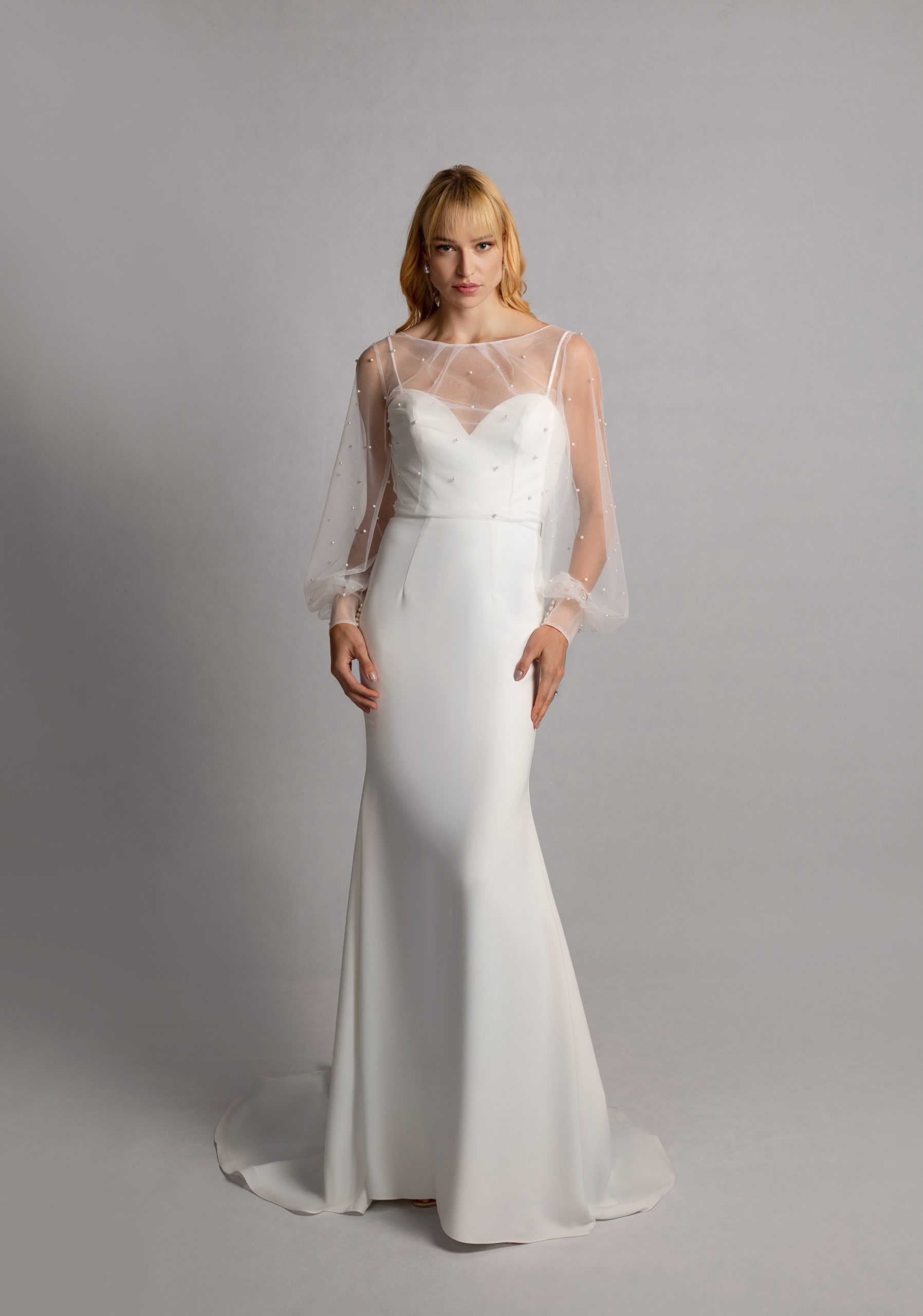 A modern pearl adorned cover-up featuring statement bell sleeves and a delicate tie back closure