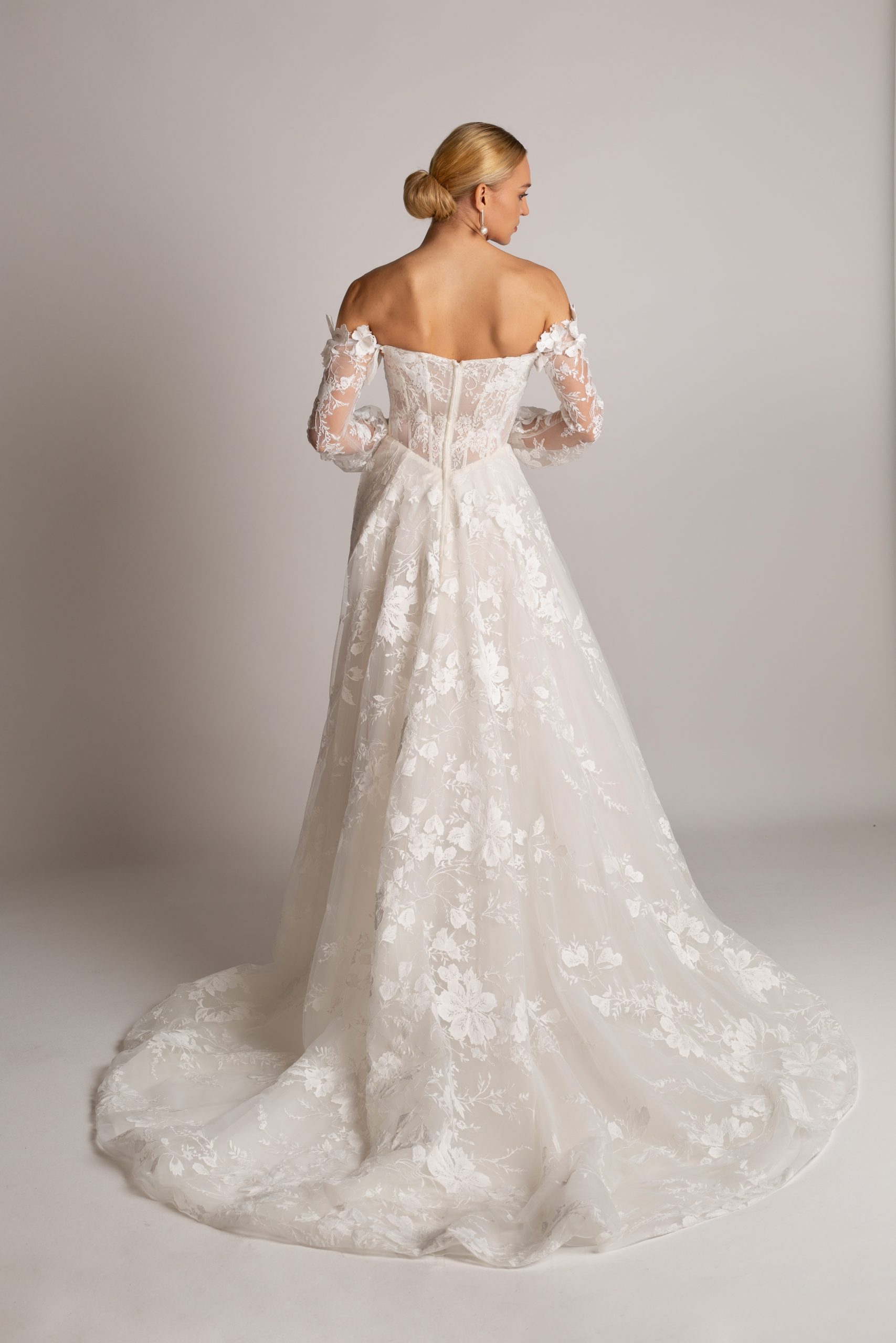 A romantic off-the-shoulder cotton lace dress featuring a soft, semi-sheer bodice lined with Chantilly lace and organza
